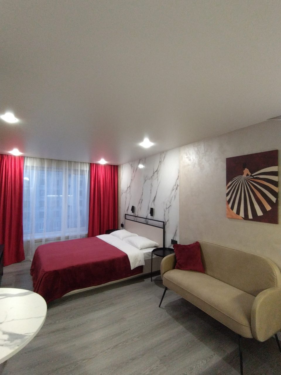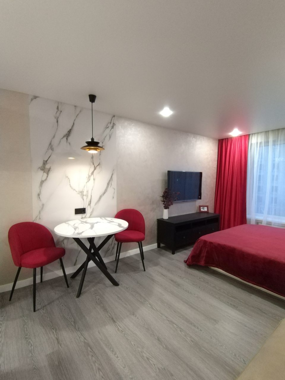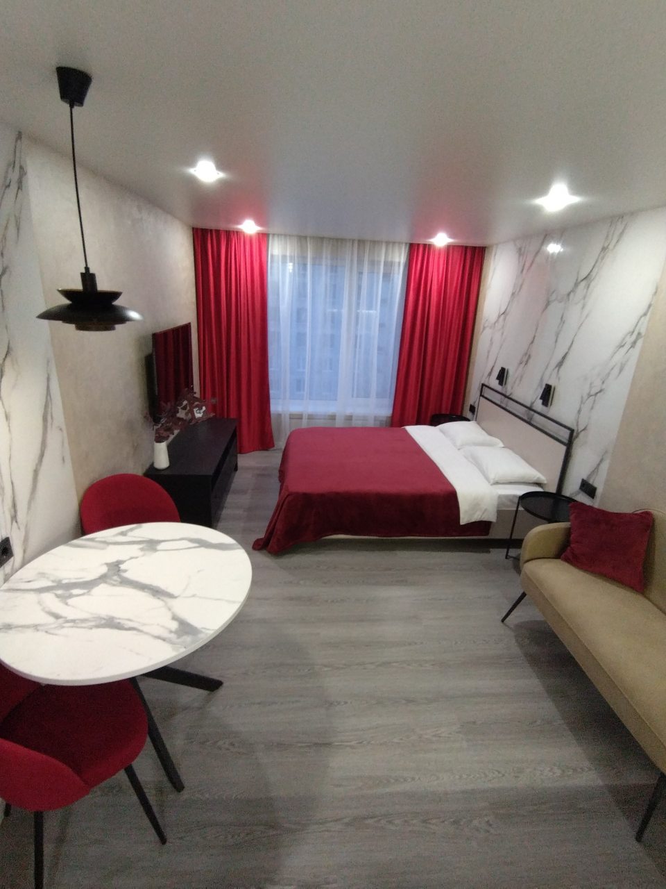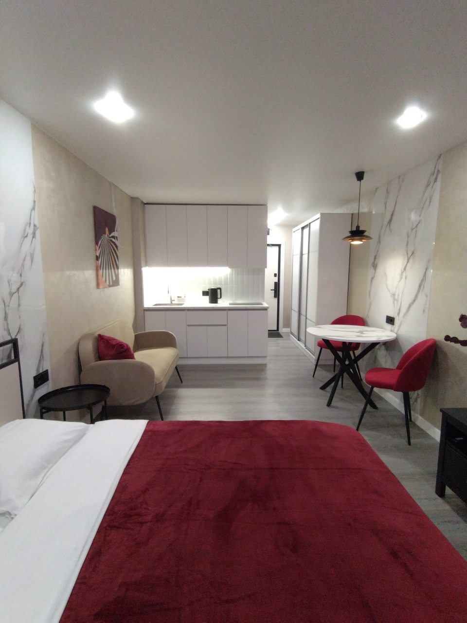 Яркие апартаменты оснащены двуспальной кроватью, прикроватной мебелью, затемненными шторами, шкафом, телевизором, вешалками для верхней одежды, кухонной зоной и собственной ванной комнатой. Доступна точка wi-fi. Санузел оборудован качественной сантехникой и стиральной машиной.
