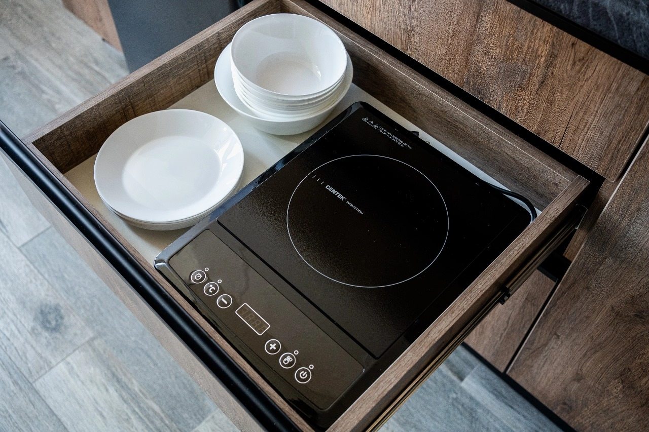 Кухня укомплектована электроплитой, электрочайником, холодильником, комплектом посуды, обеденным столом и др. Пообедать можно в одном из ближайших кафе.