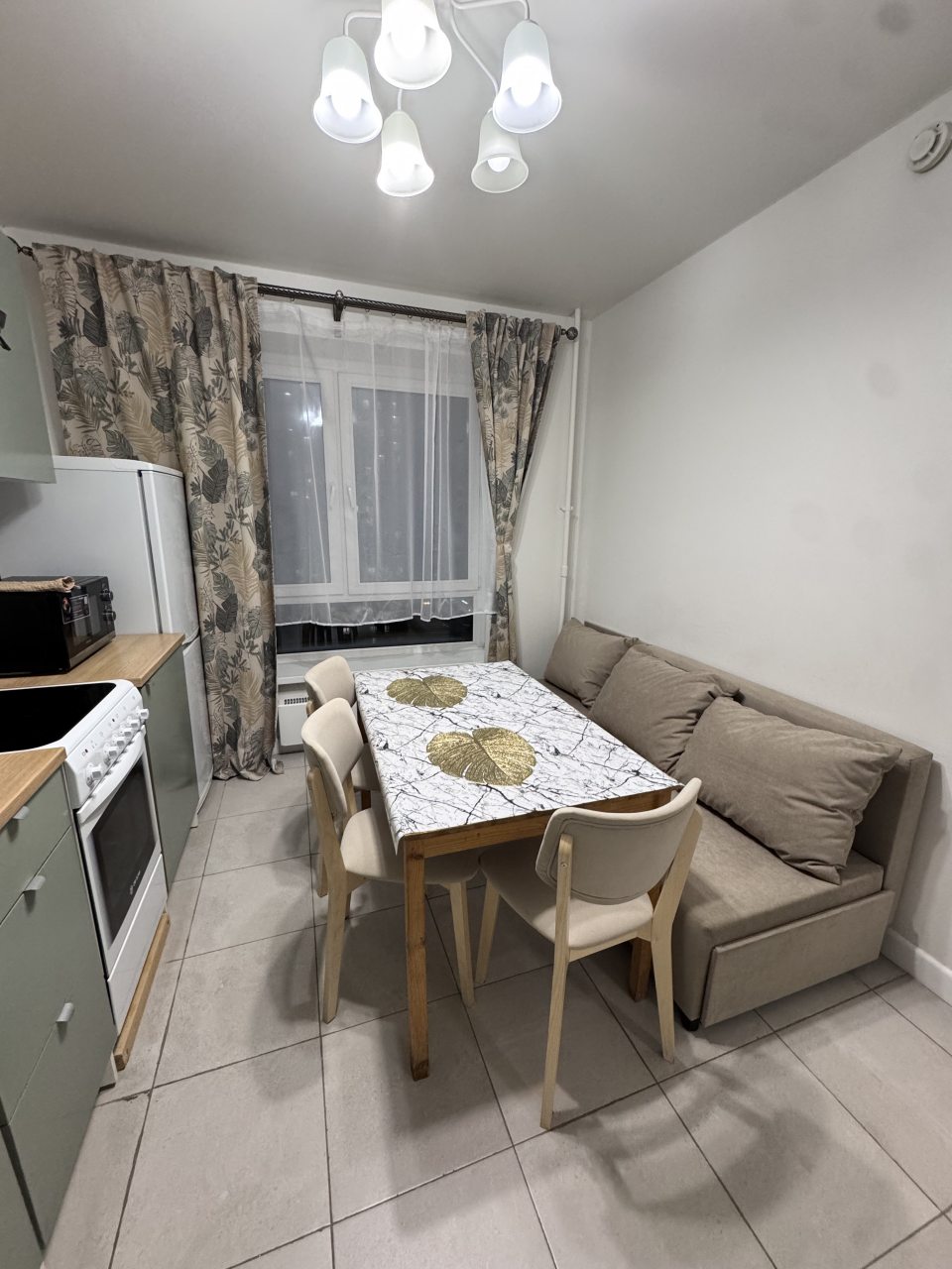 На кухонной зоне имеется необходимая техника для приготовления еды, а также вытяжка и столовые приборы. Поблизости работают рестораны и магазины.