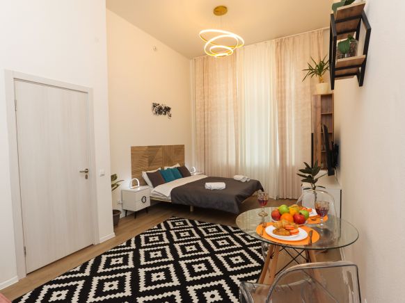 Проживала здесь несколько дней. Выбрала эту студию, так как находилась в командировке, и эти апартаменты имеют наилучшее расположение, от места работы, буквально два шага. Как же это приятно, так быстро возвращаться домой после тяжелого рабочего дня, была бы моя воля, я бы тут и осталась. В квартире есть все необходимое для комфортного проживания: удобная мебель, красивый интерьер, телевизор, интернет, небольшая кухонная зона со всеми столовыми приборами, посудой и бытовой техникой, стиральная машина.