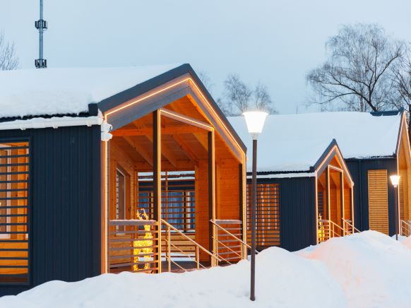 Для проживания предоставляются деревянные домики, в которых можно разместить от двух до шести человек. Каждый коттедж оснащен эргономичными кроватями, современной техникой и необходимой мебель. В ванной установлены душ и туалет. Выдаются полотенца и набор постельного белья.