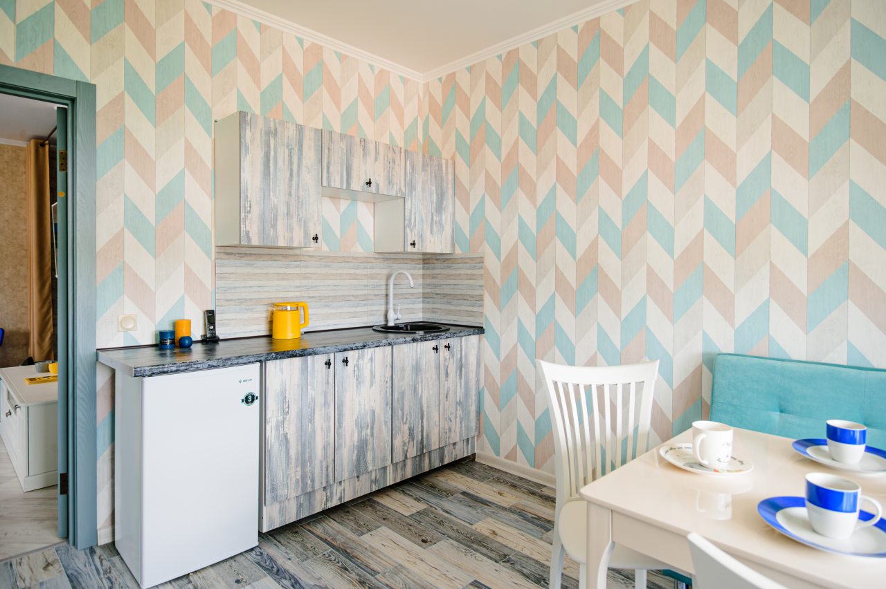 В гостиницу приехали случайно, но нам она сразу же понравилась. К выбору было представлено несколько номеров, оба они были отлично оборудованы, имели стильный ремонт. У нас была своя кухня, она небольшая, но продуманная до деталей. Питание тут есть, но только завтраки.