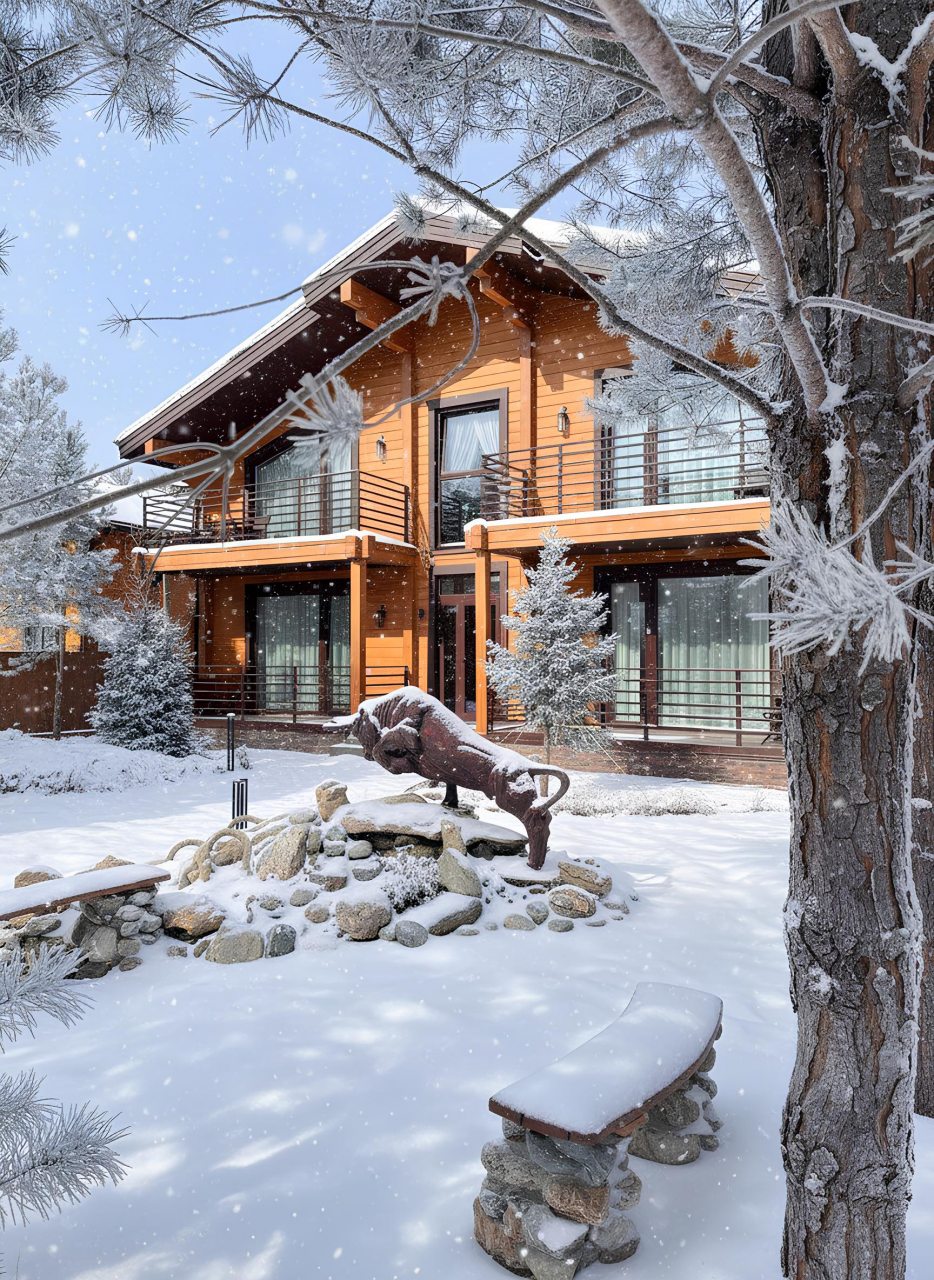 Внутри тепло и пахнет деревом. Номер просторный, с камином и панорамными окнами. Завтрак включён. Персонал заботливый, помогает с организацией досуга.