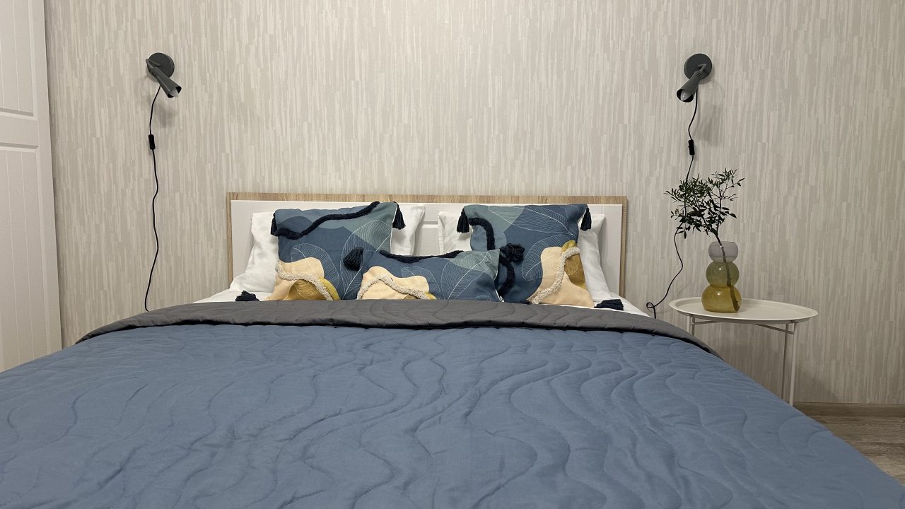 Внутри вас ожидает большая и удобная кровать, затемненные шторы для лучшего сна, настенные бра, вместительные шкафы, зона отдыха с диваном и телевизором, ванная комната со стиральной машиной.