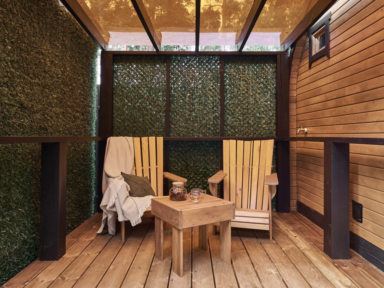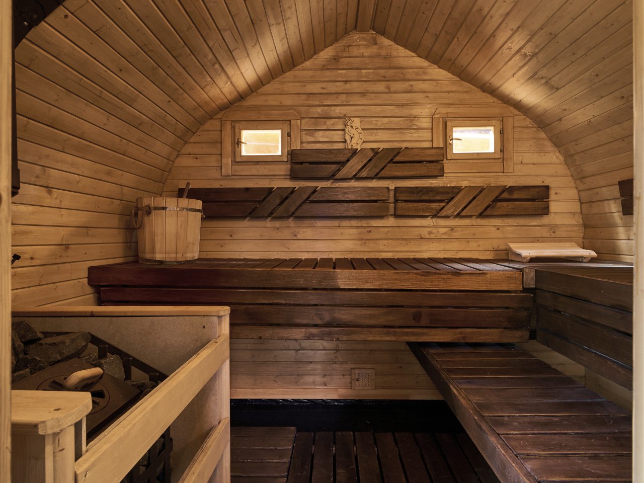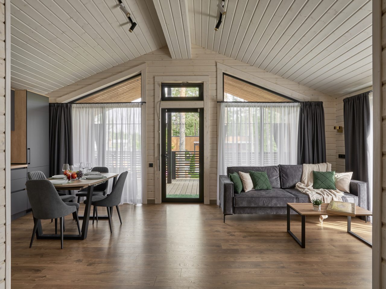 Предоставляются уютные дома, рассчитанные на 6 человек. Интерьер продуман до мелочей, чтобы каждый гость чувствовал себя комфортно: удобная мебель и качественная техника. У каждого дома на террасе имеется открытая купель-джакузи с подогреваемой водой.
