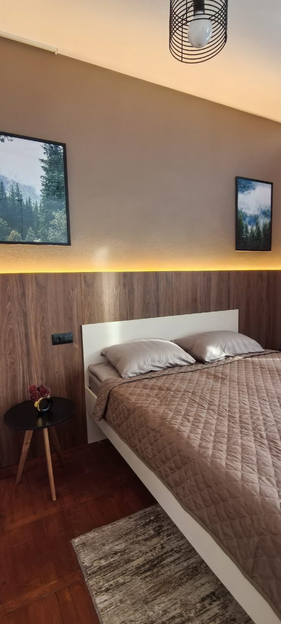 Номера обустроены в современном стиле интерьера и оснащены качественной мебелью и техникой: двуспальная кровать, шкаф для хранения вещей, комплект полотенец, мягкий диван. В собственной ванной комнате имеется фен и индивидуальные средства гигиены.