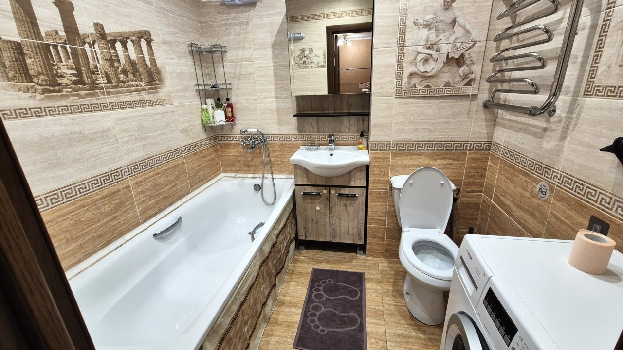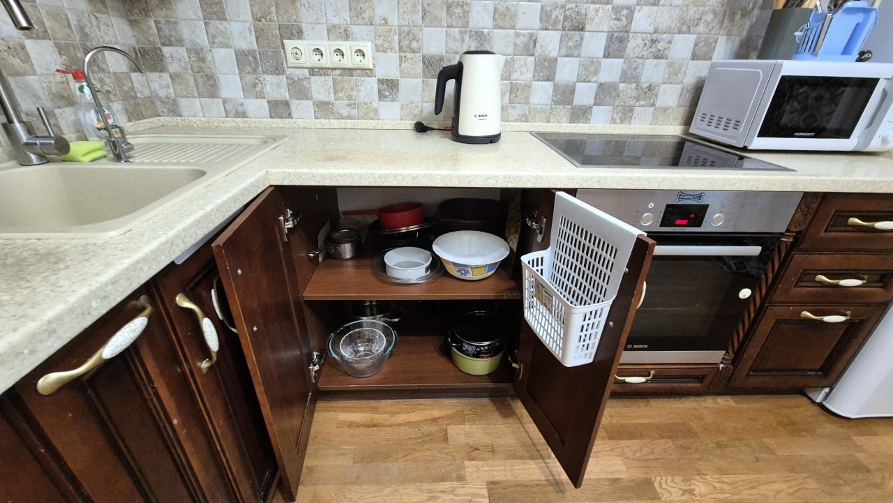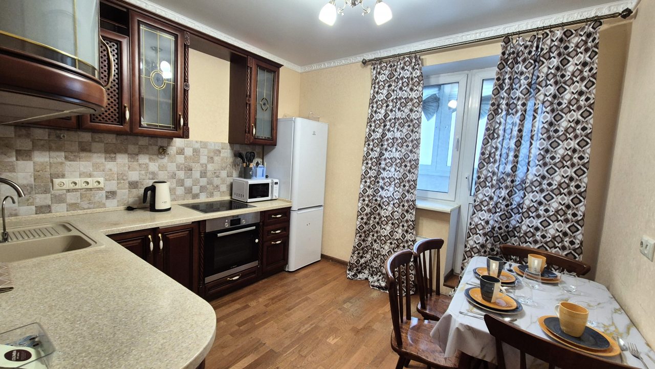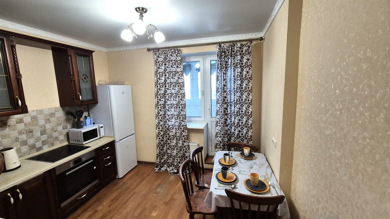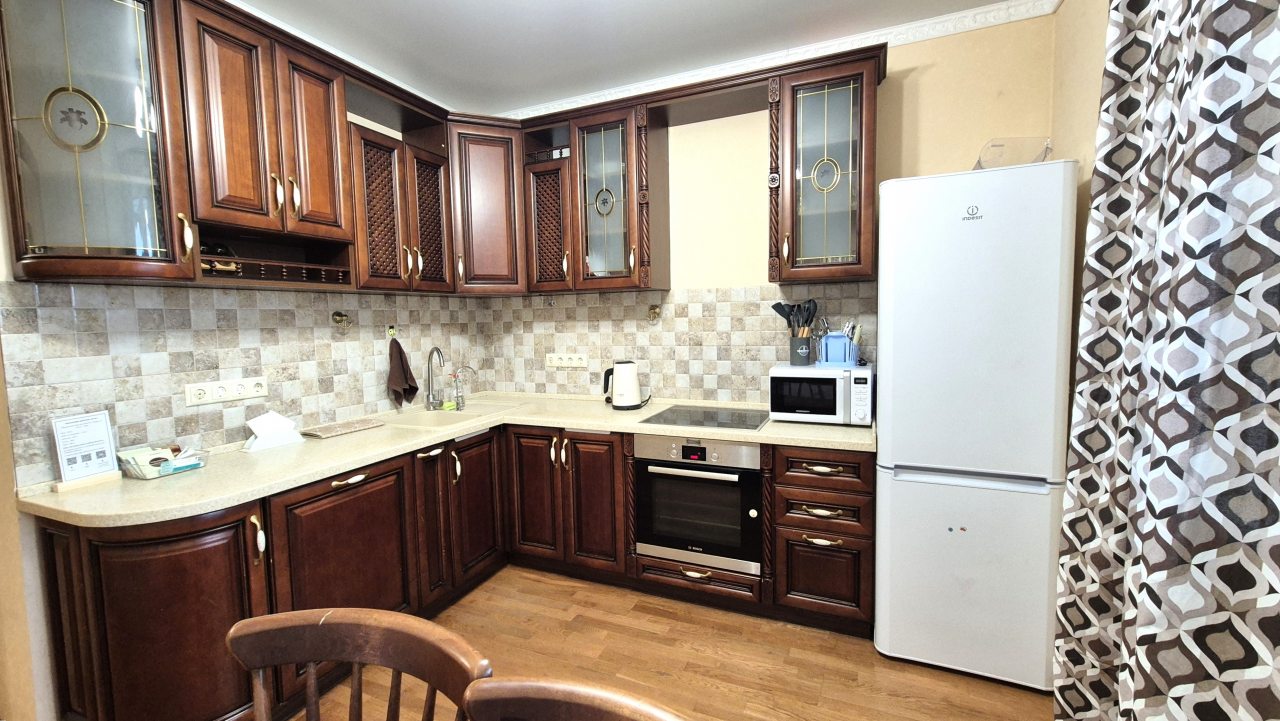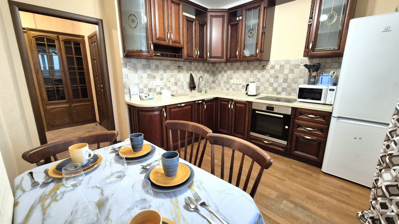 Кухня укомплектована стильным гарнитуром, обеденным столом и необходимой бытовой техникой. В доступности продуктовые магазины и кафе.