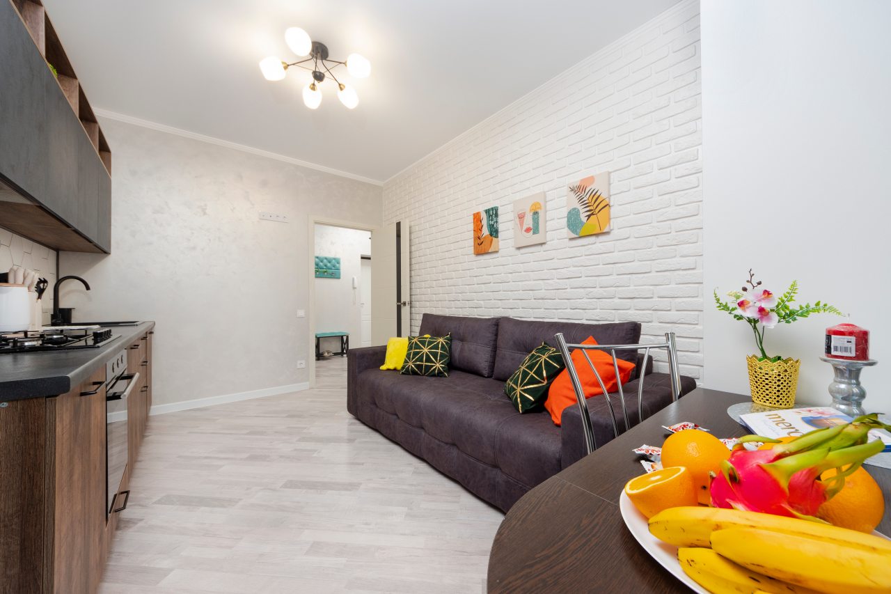 Просторная кухня оснащена комплектом стильного гарнитура, газовой плитой, холодильником, микроволновой печью, электрочайником и др. В шаговой доступности кафе и продуктовый магазин.