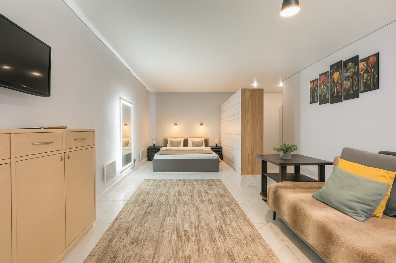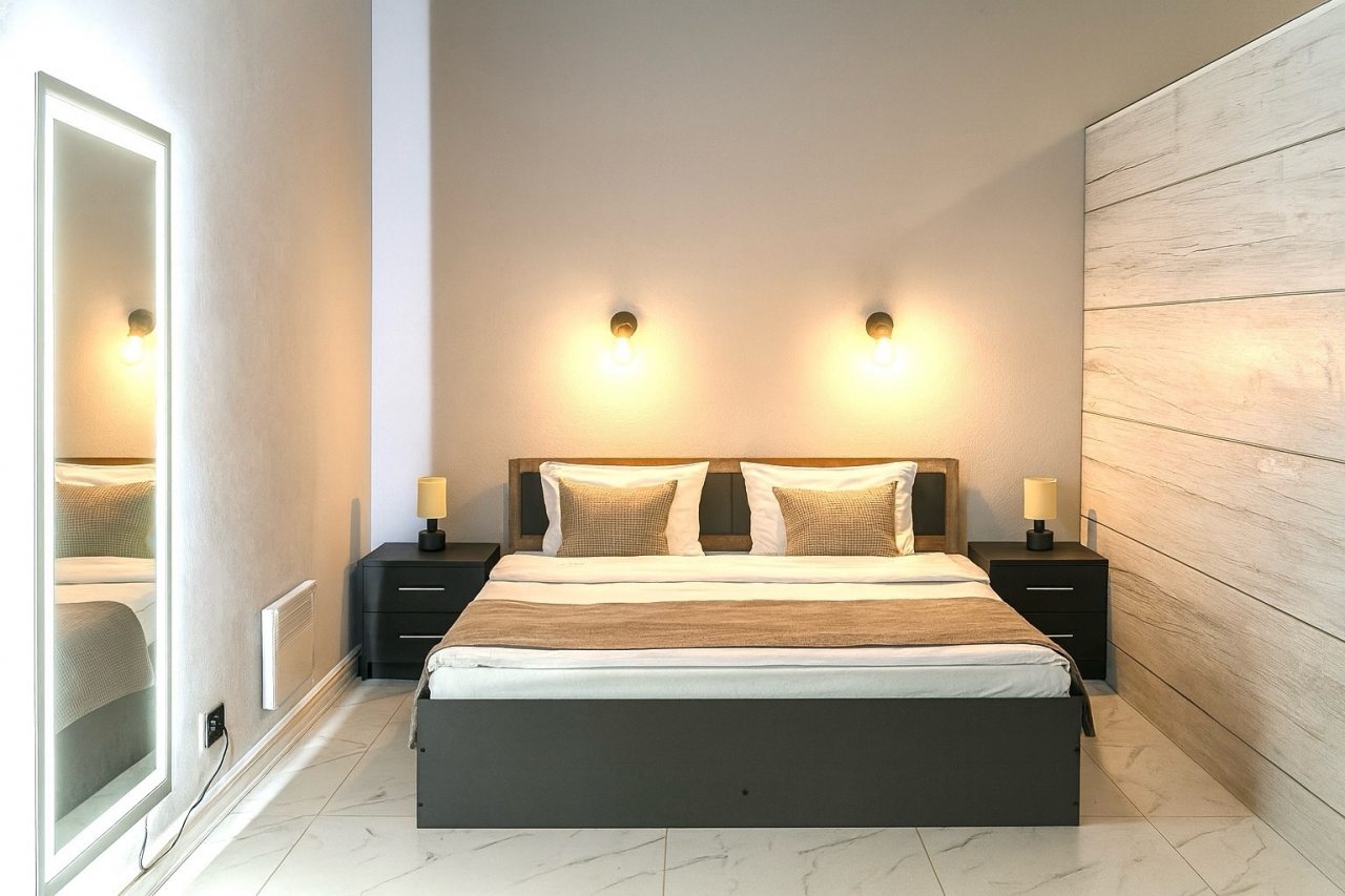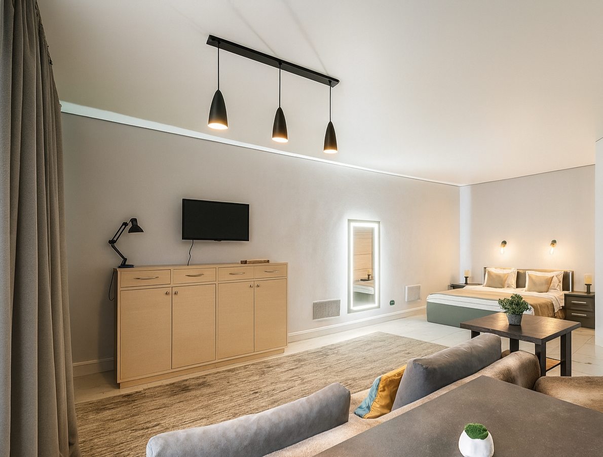 Внутри вас ожидает качественная мебель и техника, в том числе удобная двуспальная кровать, прикроватные светильники и лампы, зеркало с подсветкой, диван, телевизор, вместительный шкаф.
