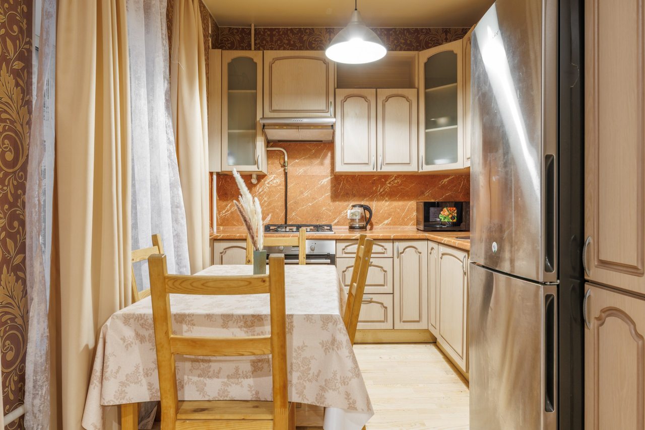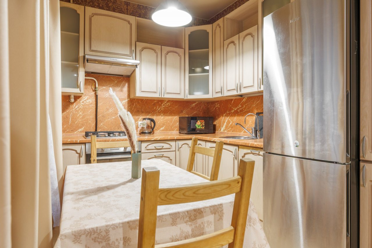 На кухне будет приятно и комфортно готовить, так как предусмотрены: плита, СВЧ, духовой шкаф, вытяжка, чайник, большая обеденная зона.