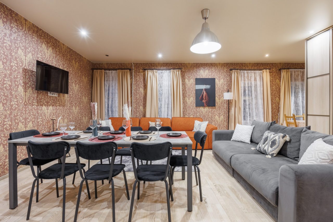 Это хороший вариант для размещения семьей или компанией, поскольку в наличии удобные и вместительные диваны, а также двуспальные кровати, просторный санузел с душевой кабиной и стиральной машиной, различная мебель для хранения вещей.