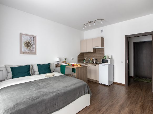 Апартаменты выполнены в современном стиле и имеют все необходимое для комфортного проживания. Установлена функциональная мебель, новое техническое оснащение и собственная ванная комната. По всему периметру работает беспроводной Интернет.