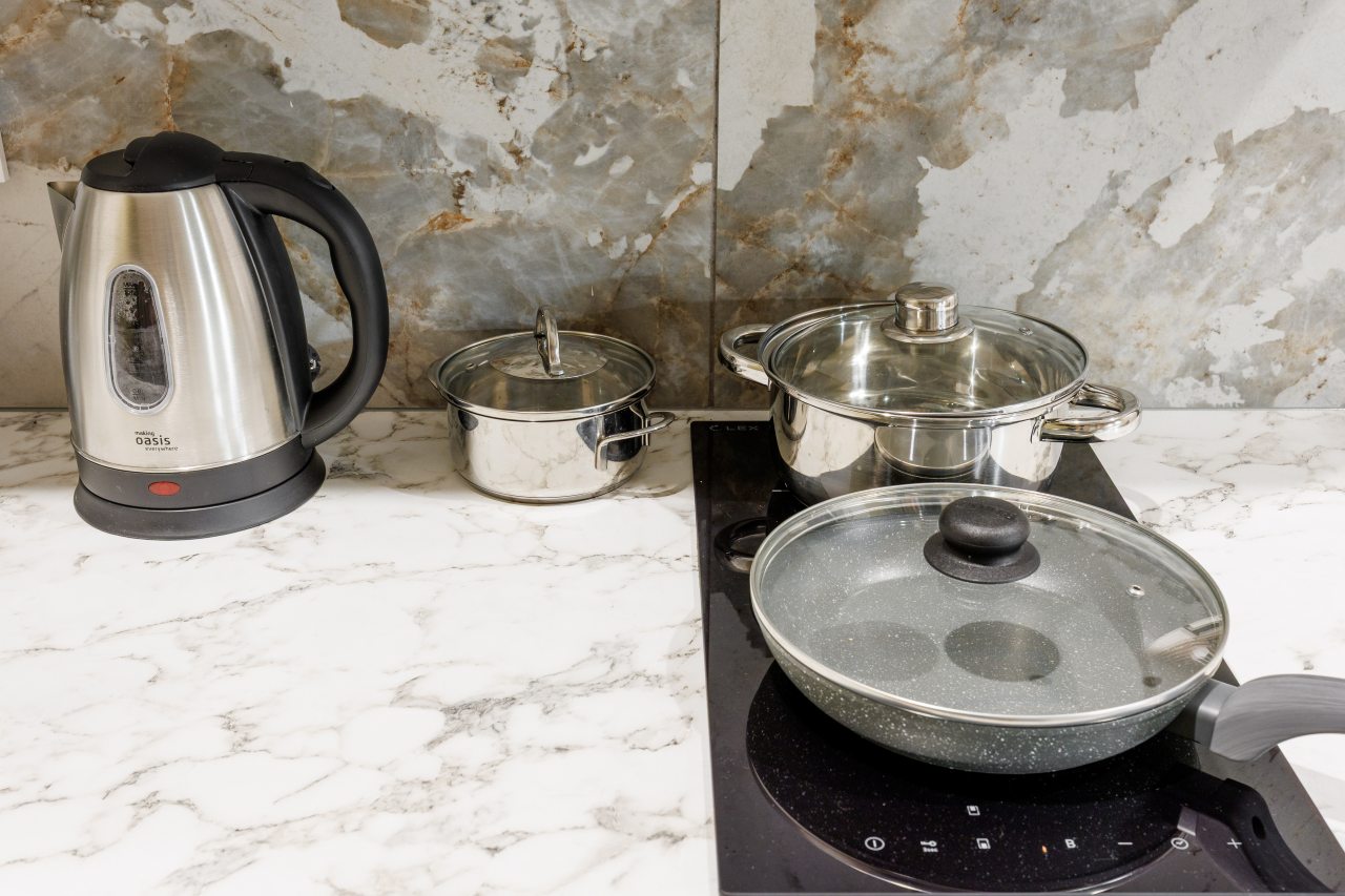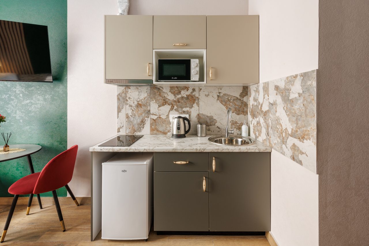 Уютная кухонная зона включает в себя СВЧ, варочную панель, чайник, холодильник и компактный обеденный стол.