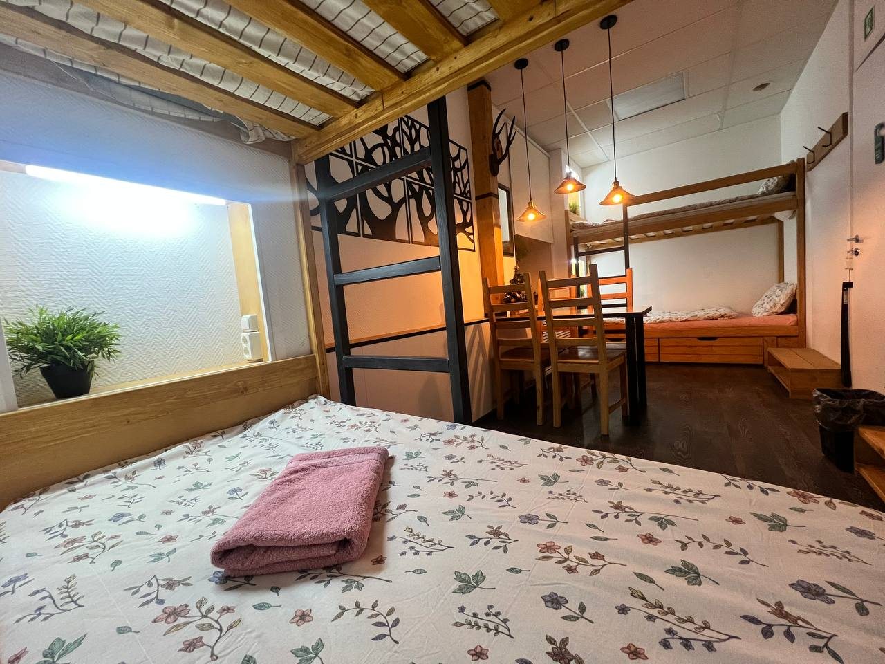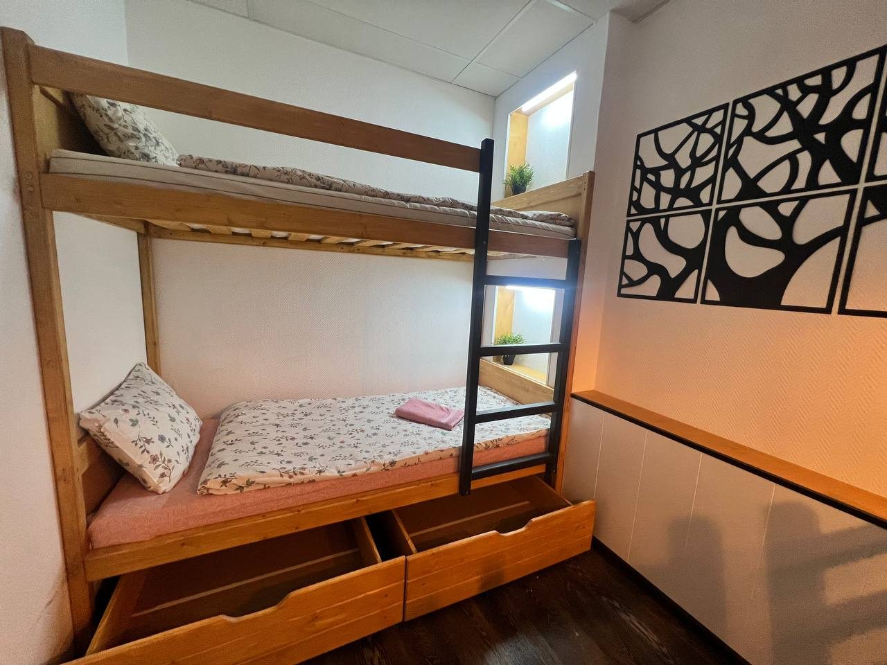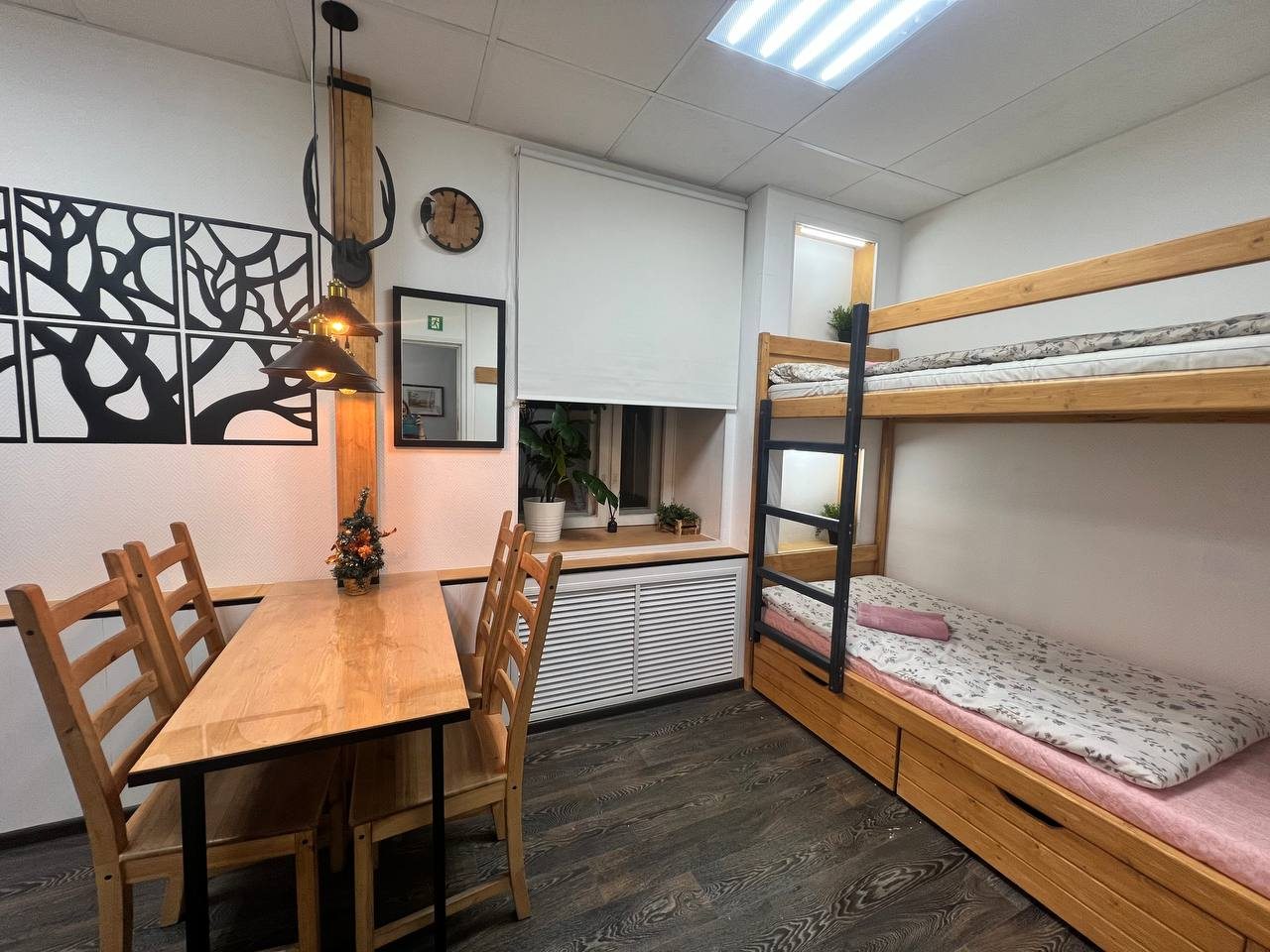 Номера предлагаются различные по вместимости. В каждом — удобная кровать, прикроватные лампы и тумбы, полотенца. Общий санузел укомплектован стандартным набором сантехники. Дополнительно предусмотрена стиральная машина.