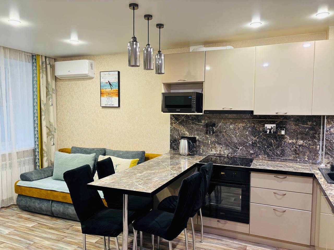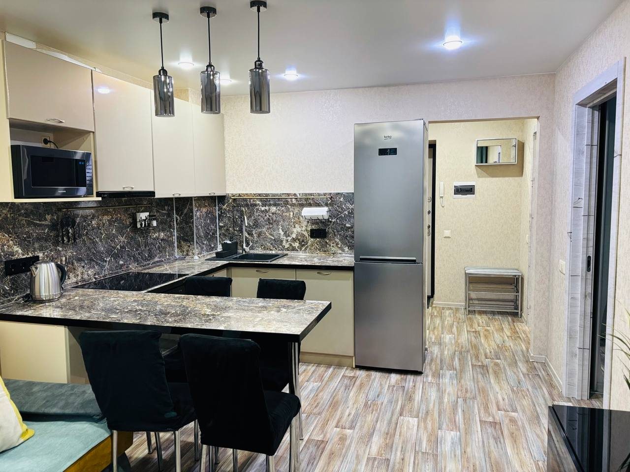 Кухня укомплектована стильным гарнитуром, холодильником, электрочайником, варочной панелью, микроволновой печью, духовым шкафом и др. В шаговой доступности кондитерская, продуктовый магазин и кафе.