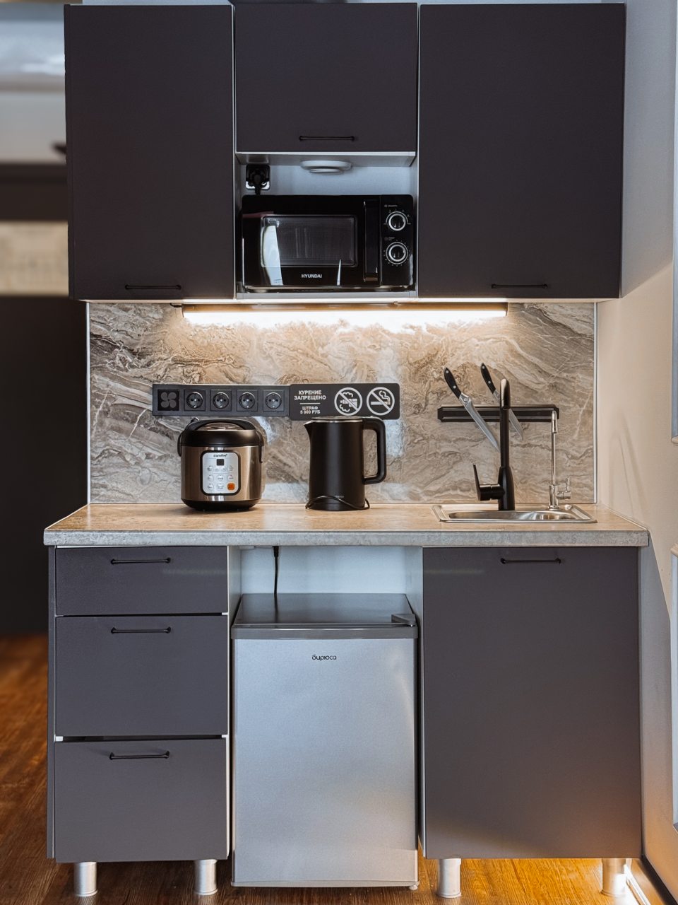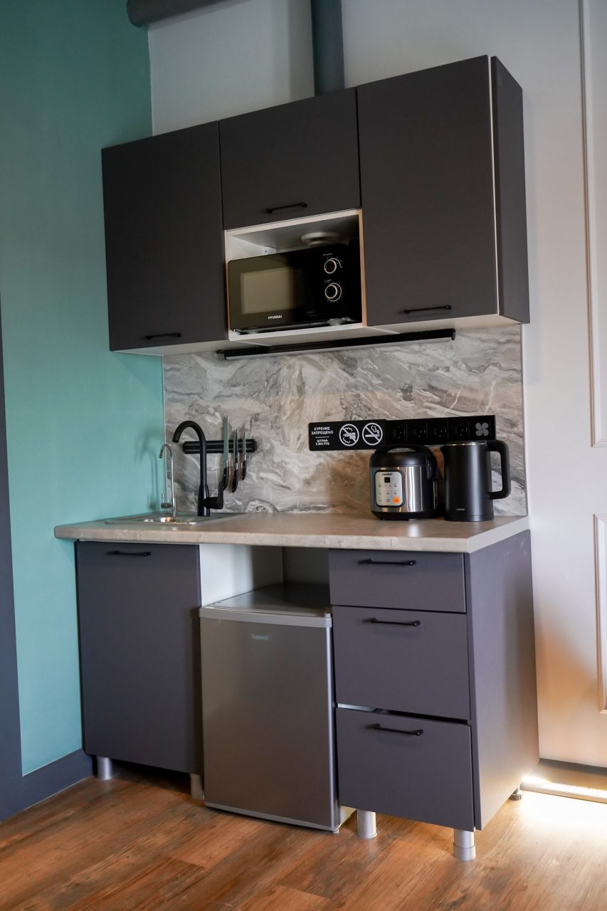 Некоторые номера оснащены кухонной зоной: микроволновая печь, холодильник, чайник, мультиварка. Также в шаговой доступности есть множество заведений питания, где можно как вкусно перекусить, так и сытно пообедать.