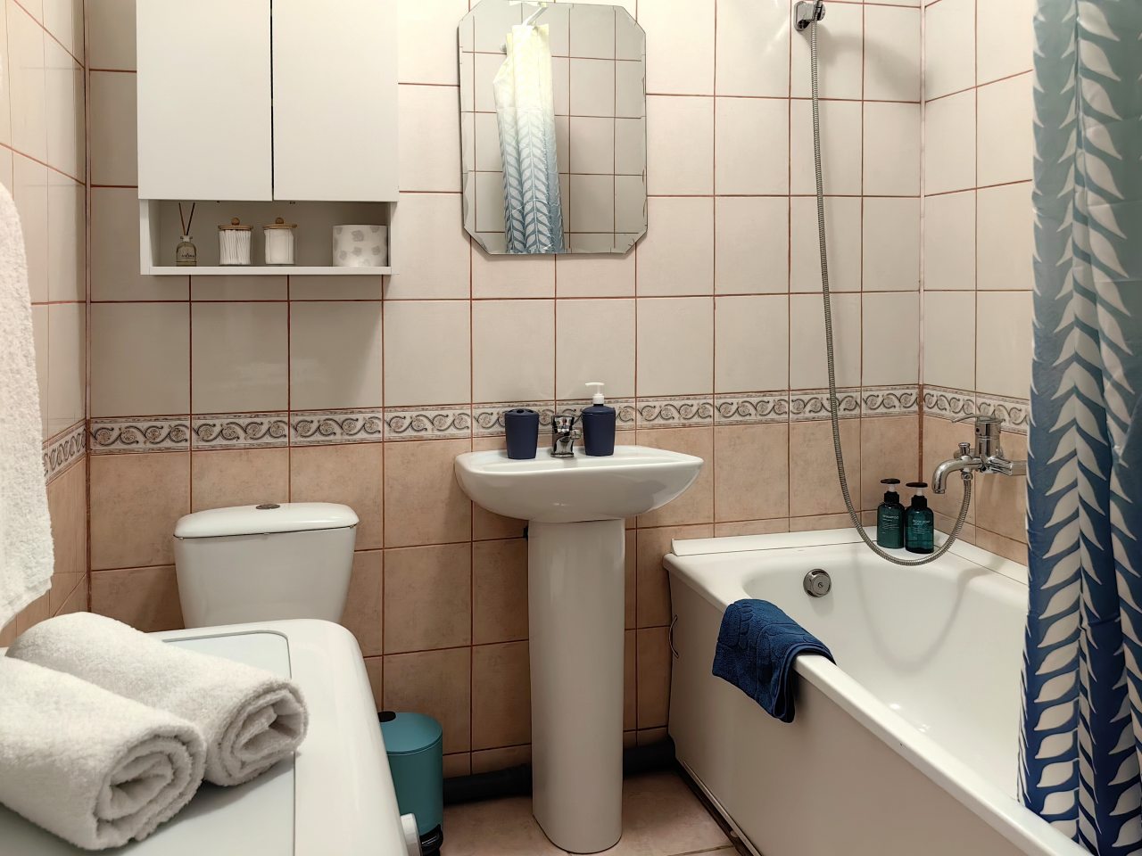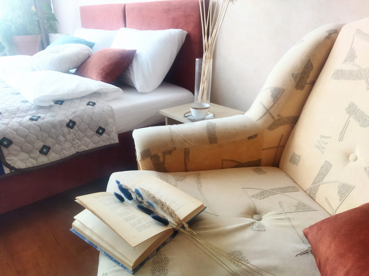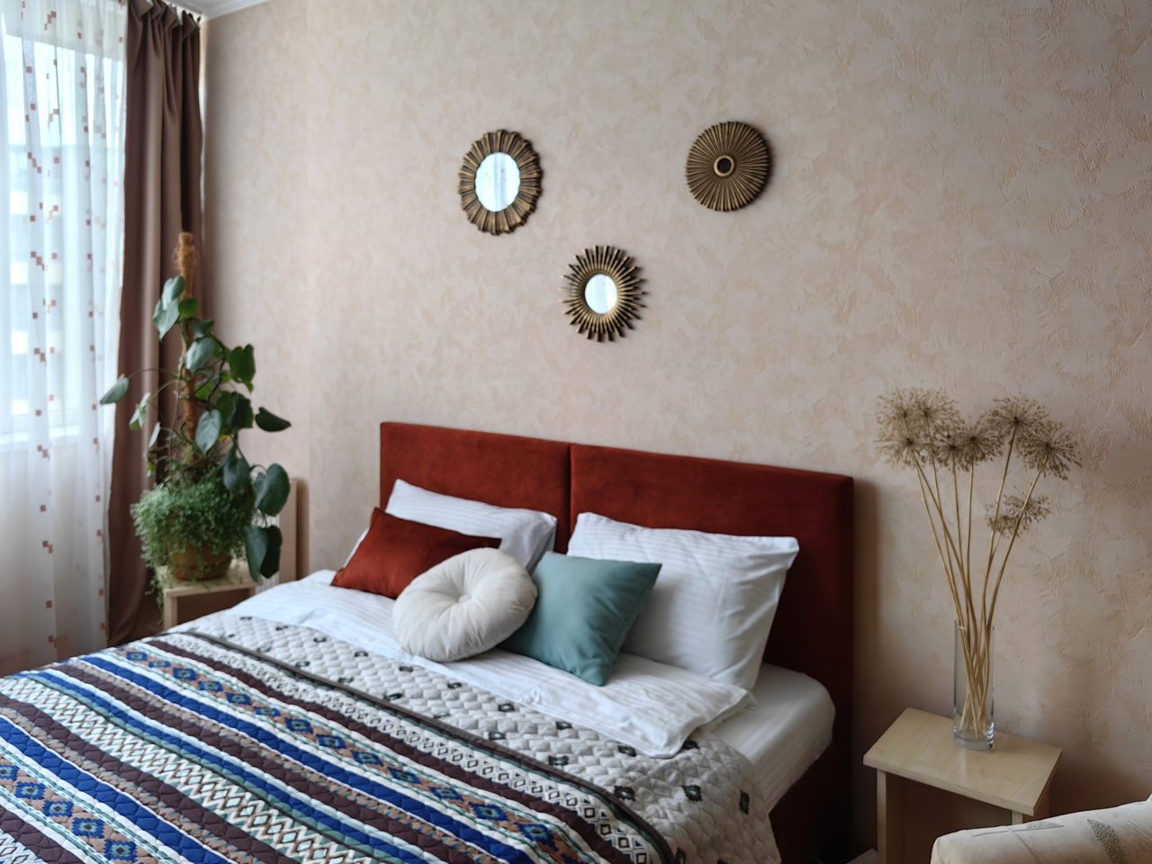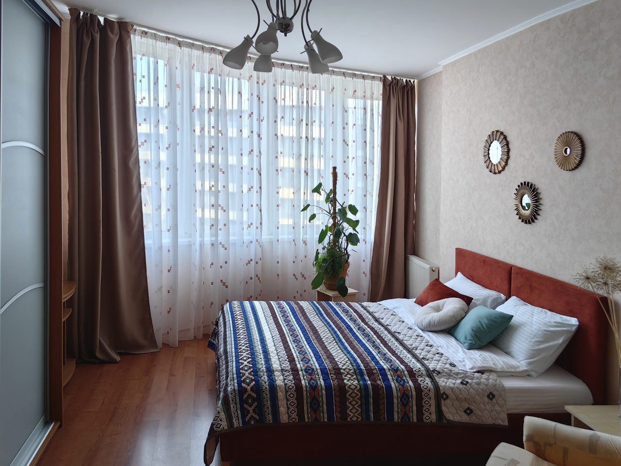 Уютные апартаменты оснащены большими окнами, двуспальной кроватью со свежим постельным бельем, затемненными шторами, шкафом, телевизором, гладильными принадлежностями, кухней со всей необходимой бытовой техникой, собственной ванной комнатой и Wi-Fi. Санузел укомплектован качественной сантехникой, стиральной машиной и гигиеническими средствами.