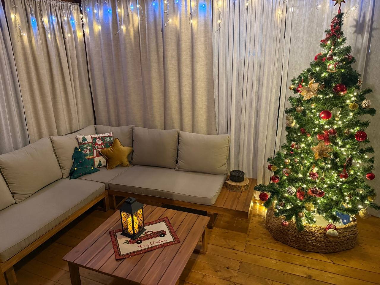 Внутри есть как спальня с удобной двуспальной кроватью, так и детская с диваном и односпальной кроватью. Также имеется уютная зона отдыха с вместительным диваном и печью. Санузел укомплектован полотенцами, стиральной машиной и необходимой сантехникой.