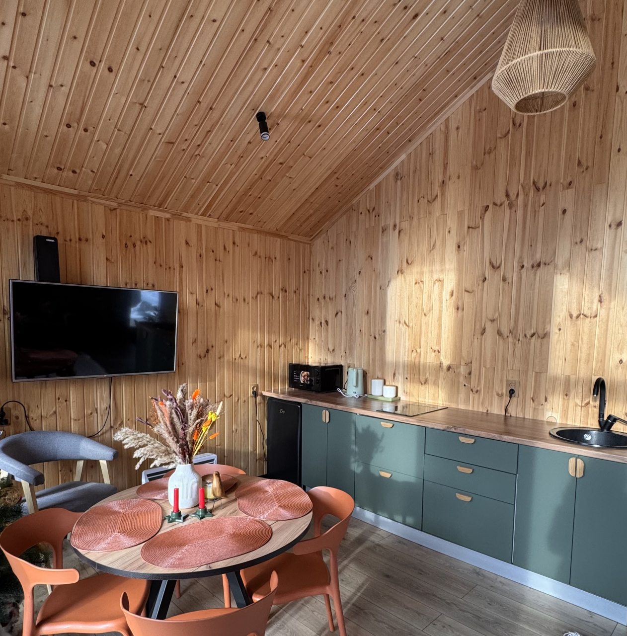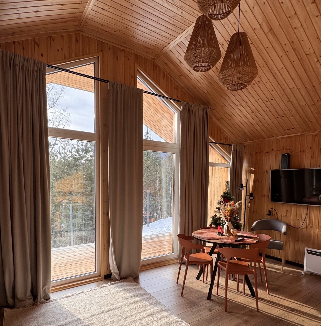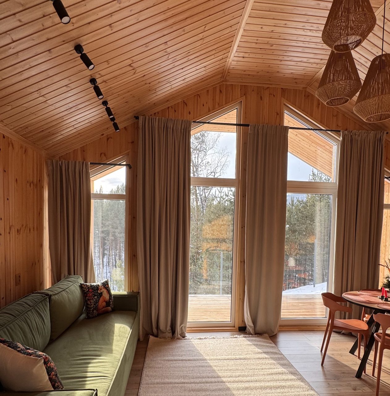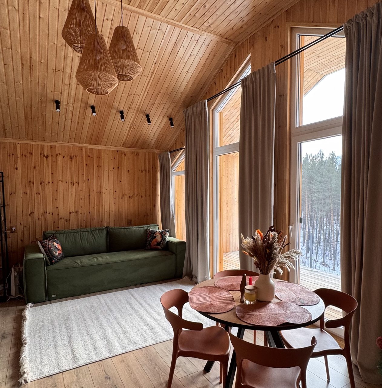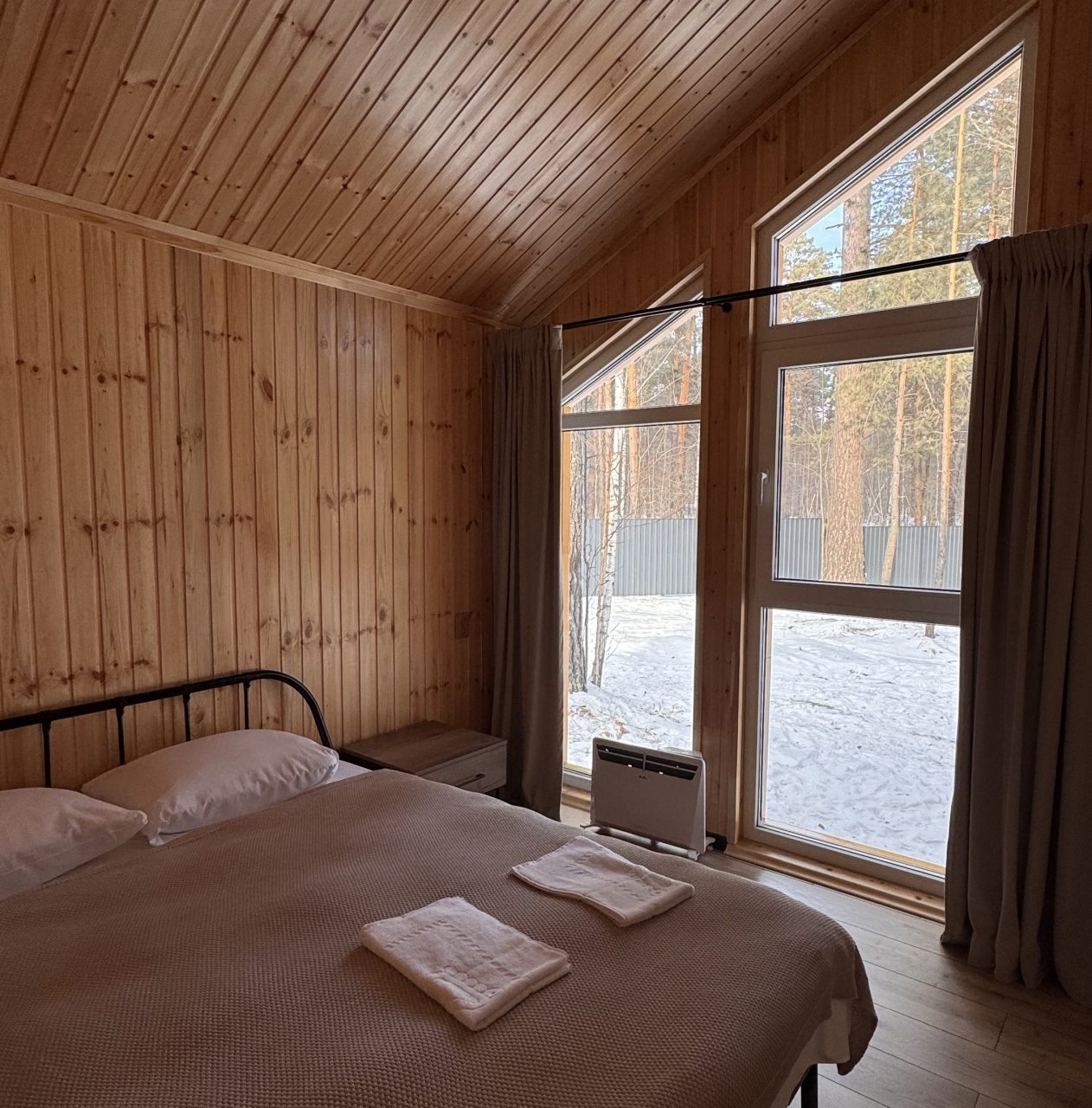 Для размещения гостей представлен уютный домик в современном стиле интерьера. Он оснащен необходимым набором мебели и техники: удобная двуспальная кровать, телевизор, мягкий диван. В санузле установлена стиральная машинка и есть средства гигиены. Из панорамных окон открывается чудесный вид на высокие сосны.
