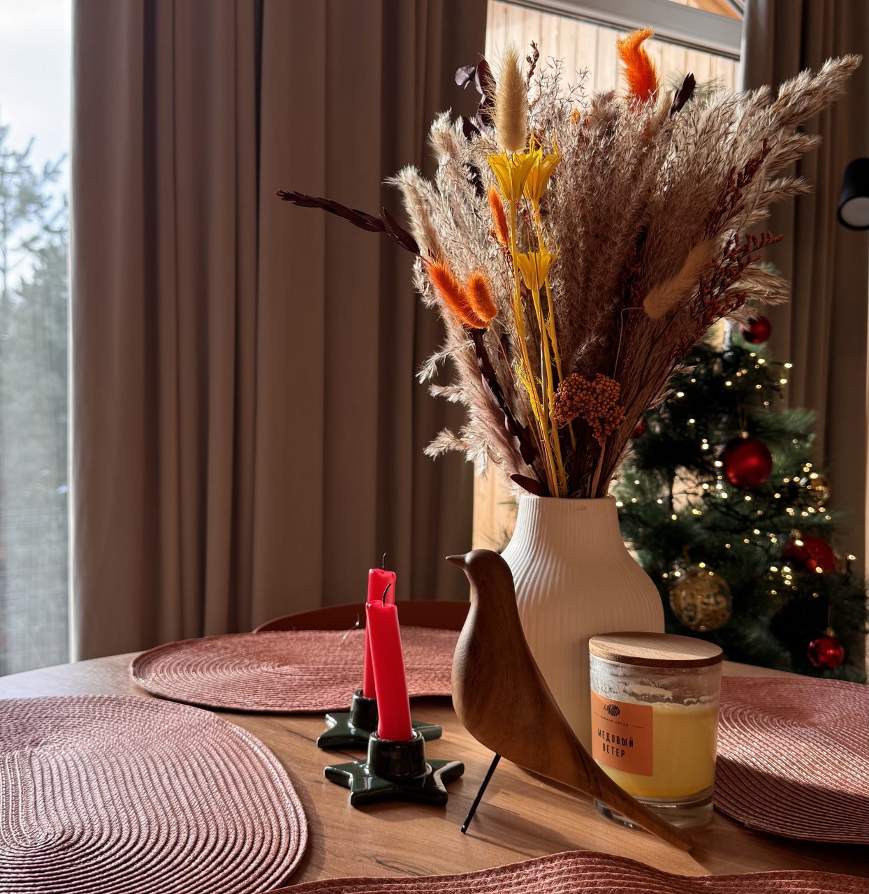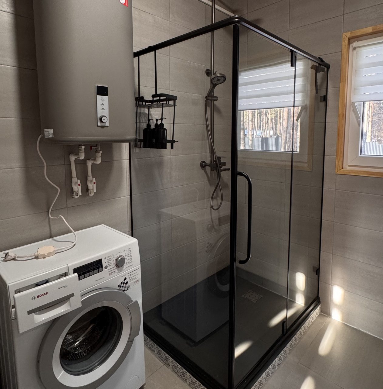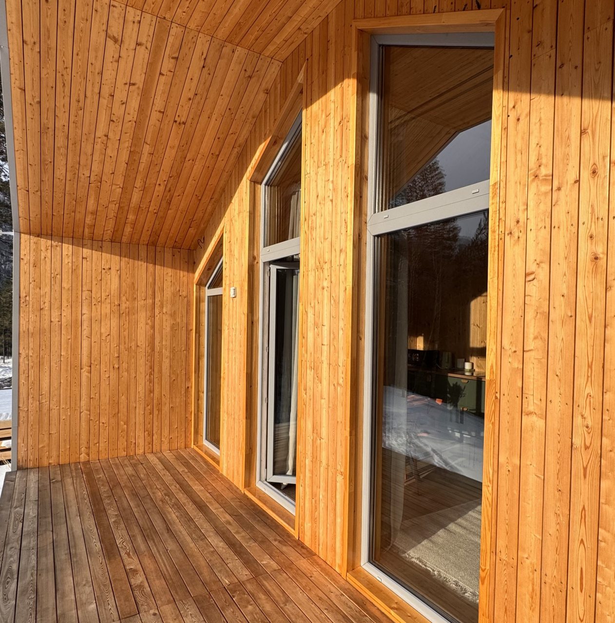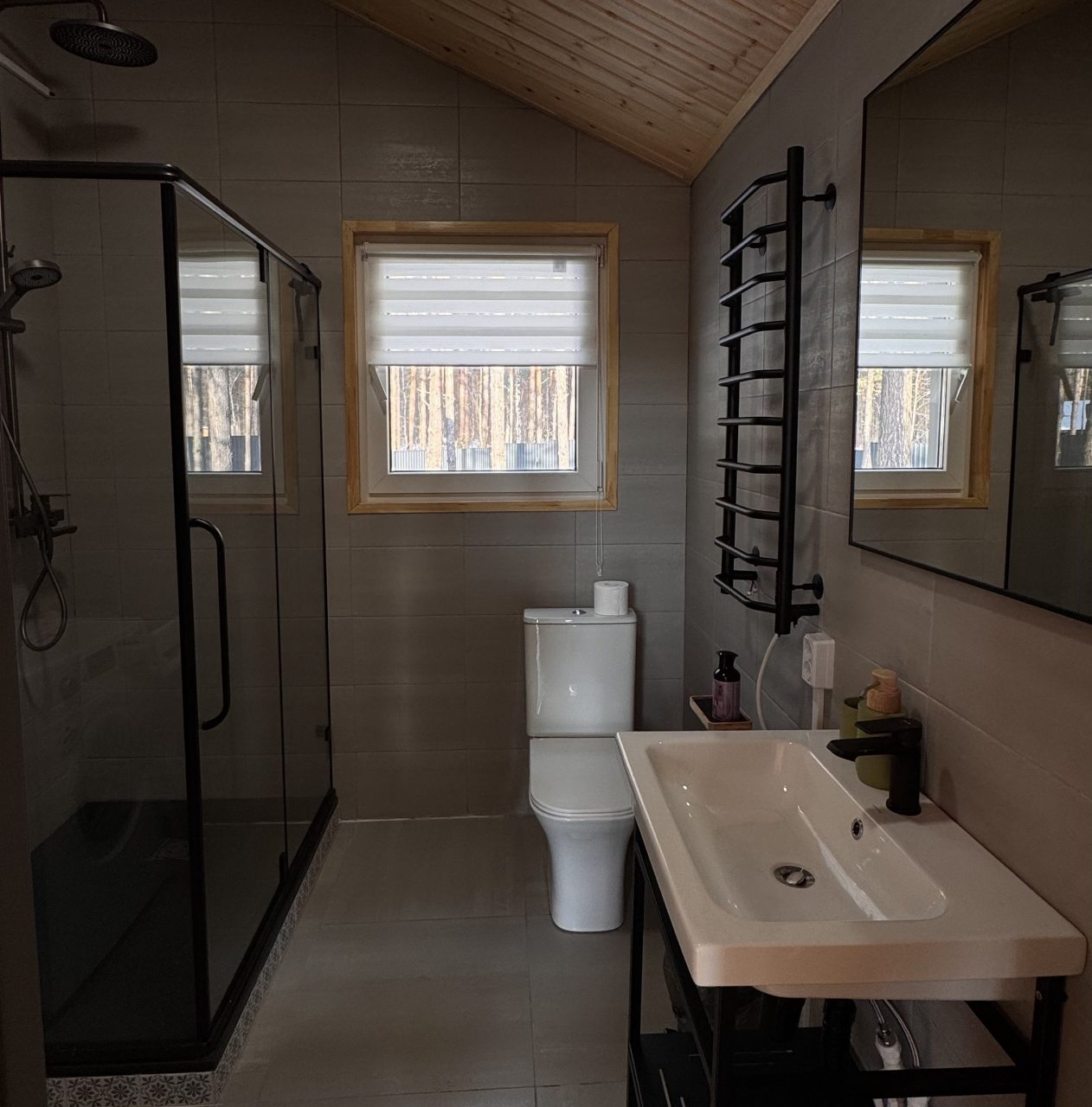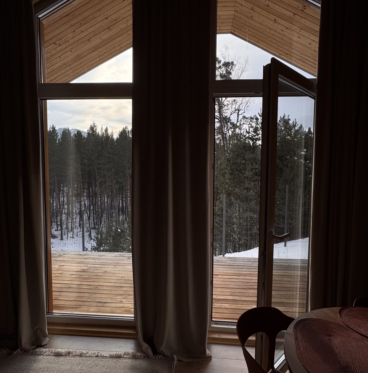 Для размещения гостей представлен уютный домик в современном стиле интерьера. Он оснащен необходимым набором мебели и техники: удобная двуспальная кровать, телевизор, мягкий диван. В санузле установлена стиральная машинка и есть средства гигиены. Из панорамных окон открывается чудесный вид на высокие сосны.