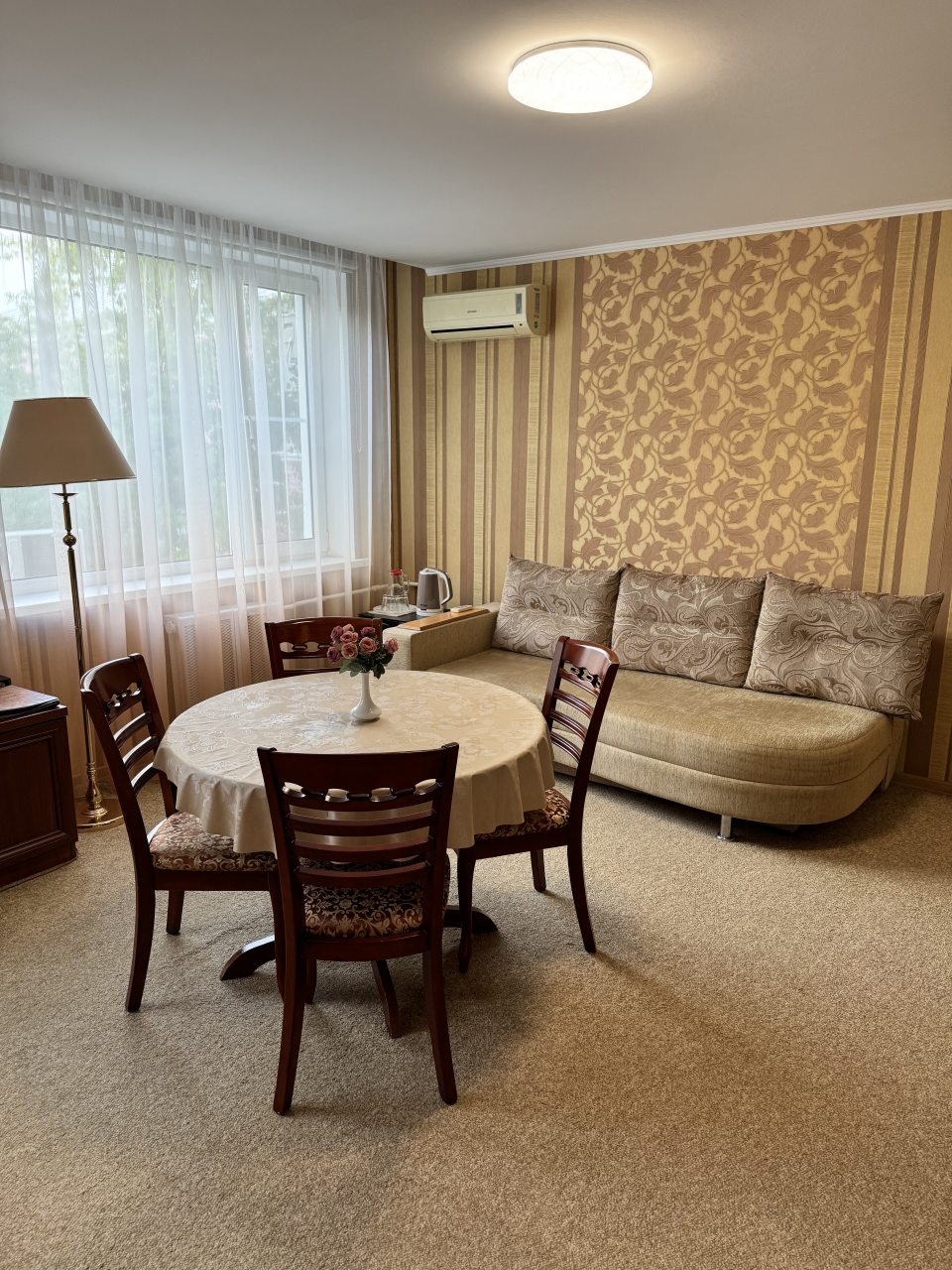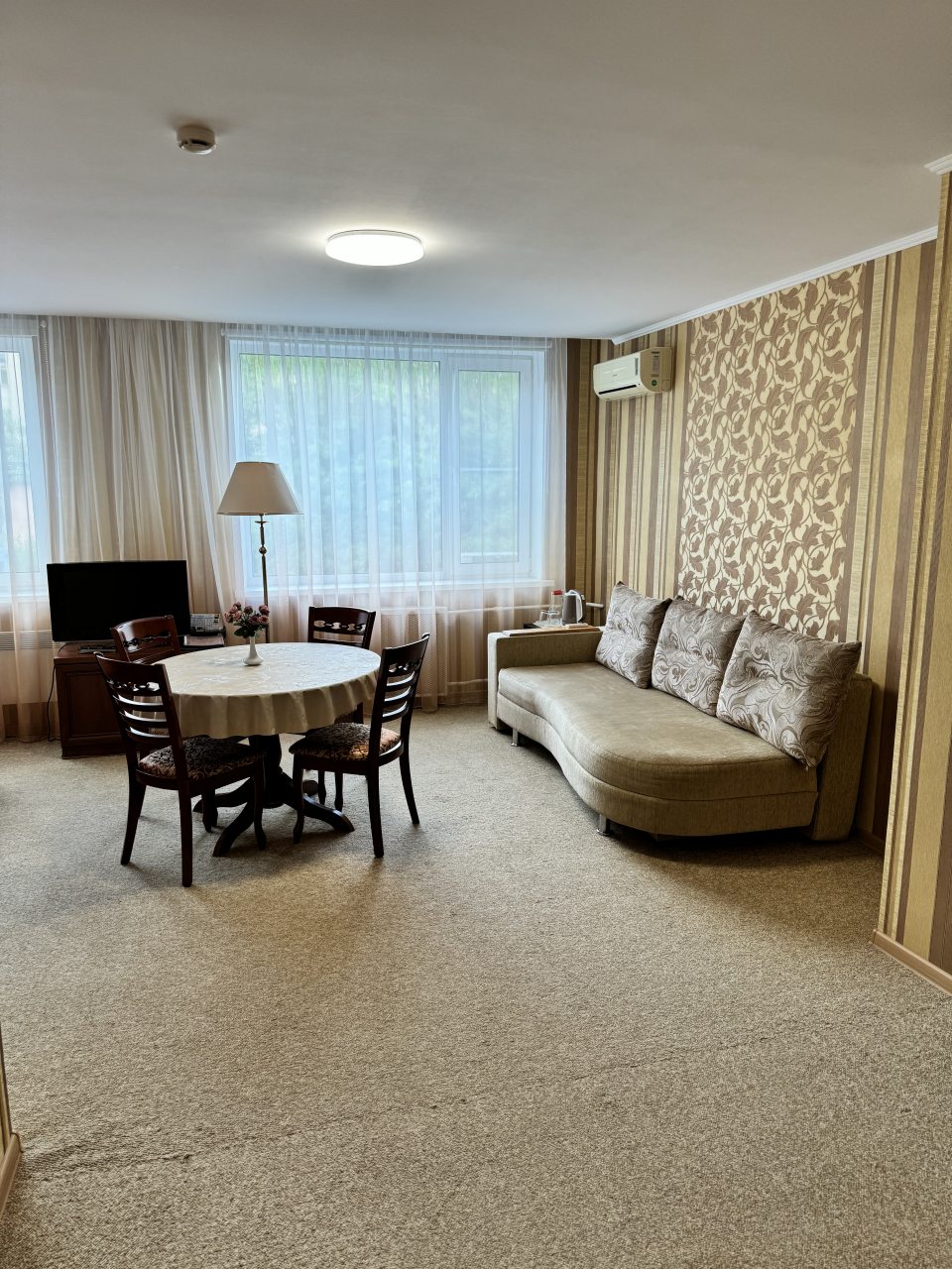 Жили в Студии. Отличный номер. Нам подошел. Много пространства, вымытые начисто окна пропускают много света. В комнате холодильник, ТВ со смарт приставкой, кондиционер, который работает, но нам не пригодился. И так температура комфортная. Завтрак приличный, порция доставочная для мужчины.