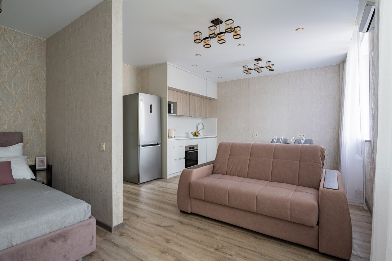Апартаменты в новом жилом комплексе встречают гостей, приехавших с туристической или деловой целью. В них имеется двуспальная кровать и раскладной диван, плазменный телевизор для просмотра фильмов, а также небольшая гардеробная с гладильными принадлежностями и просторная ванная.