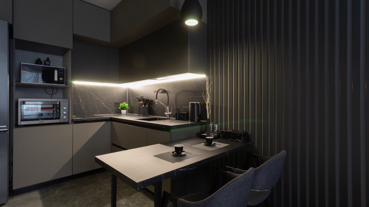 Кухонная зона имеет все необходимое для самостоятельного приготовления еды. В наличии: холодильник, микроволновая и духовая печь, плита. В распоряжении набор посуды и столовых приборов. Рядом работают кафе и продуктовые магазины.