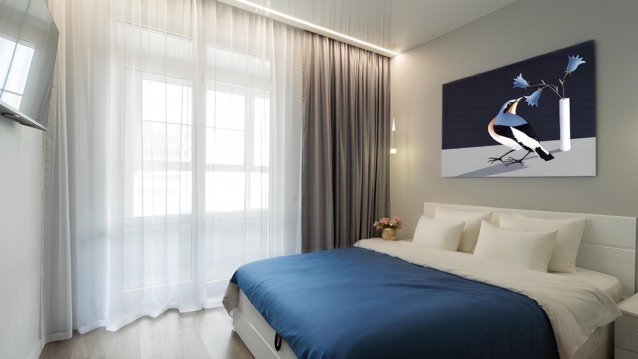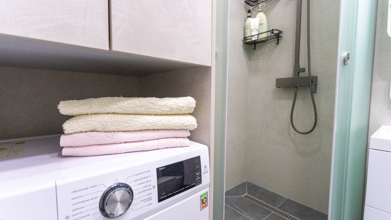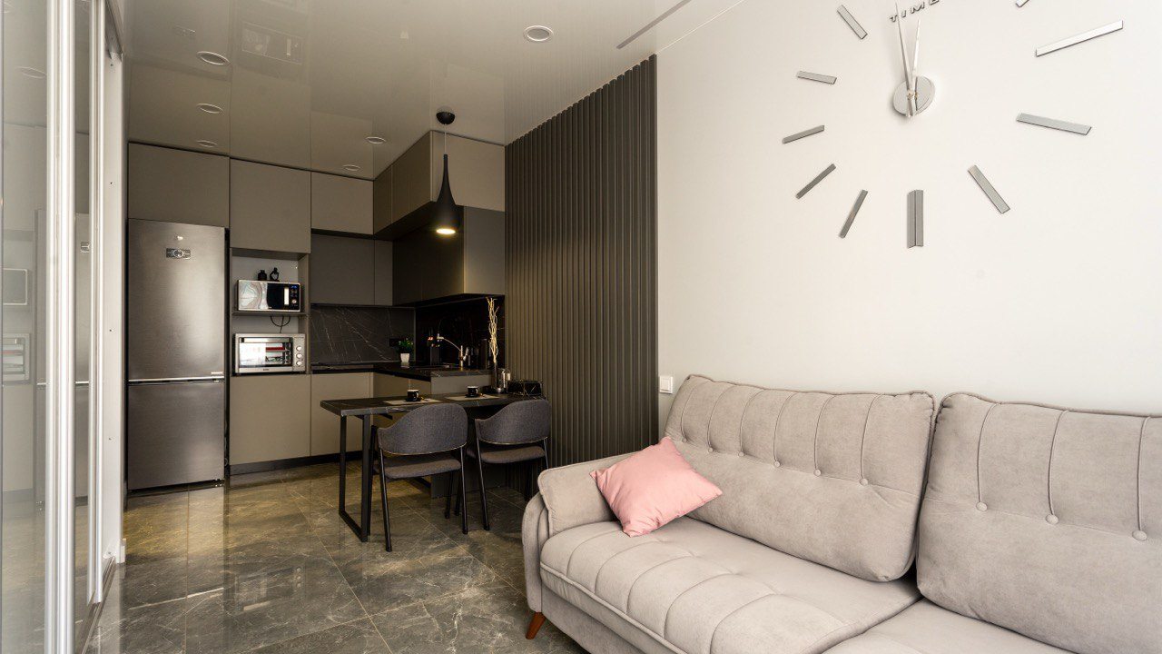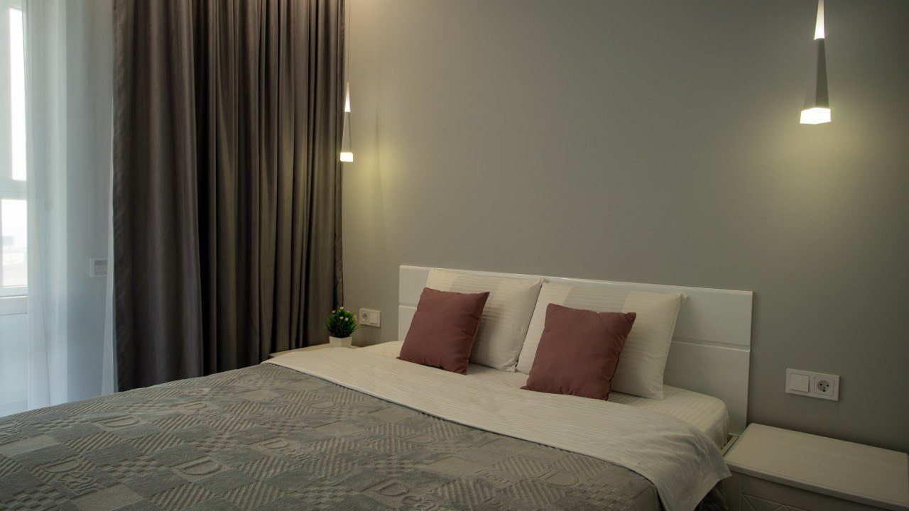 Для размещения гостей предоставляются современные апартаменты с качественным ремонтом и стильным дизайном. Для удобства установлены двуспальная кровать, телевизор и удобный диван. Благодаря таким элементам декора, как настенные часы и картины, плотные шторы, создается атмосфера уюта. В ванной комнате полный набор сантехники, включая стиральную машину.