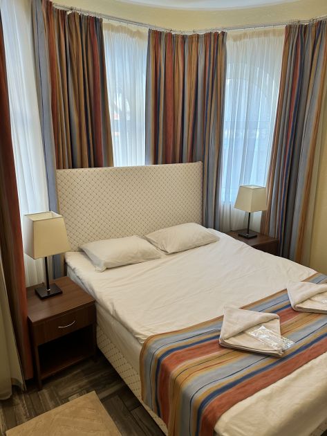Большая двуспальная кровать, удобная , пружины не впиваются , кв чистая , постельное белье , матрас ,полотенце , одеяло. Вся техника работала ,столовые приборы , посуда имеется на всех проживающих Подробнее