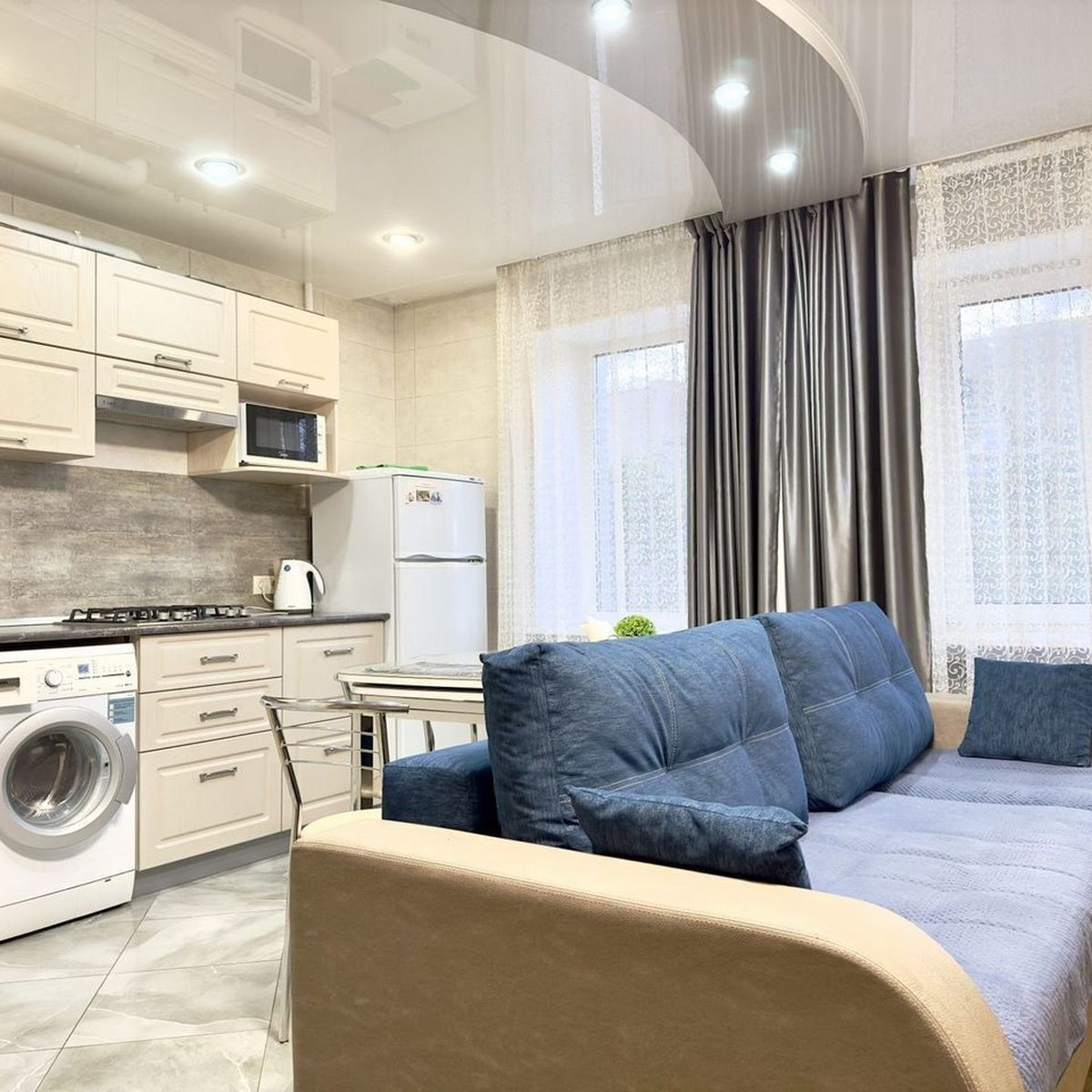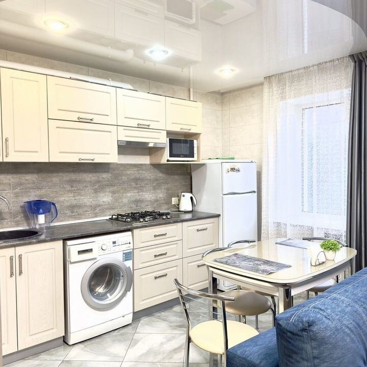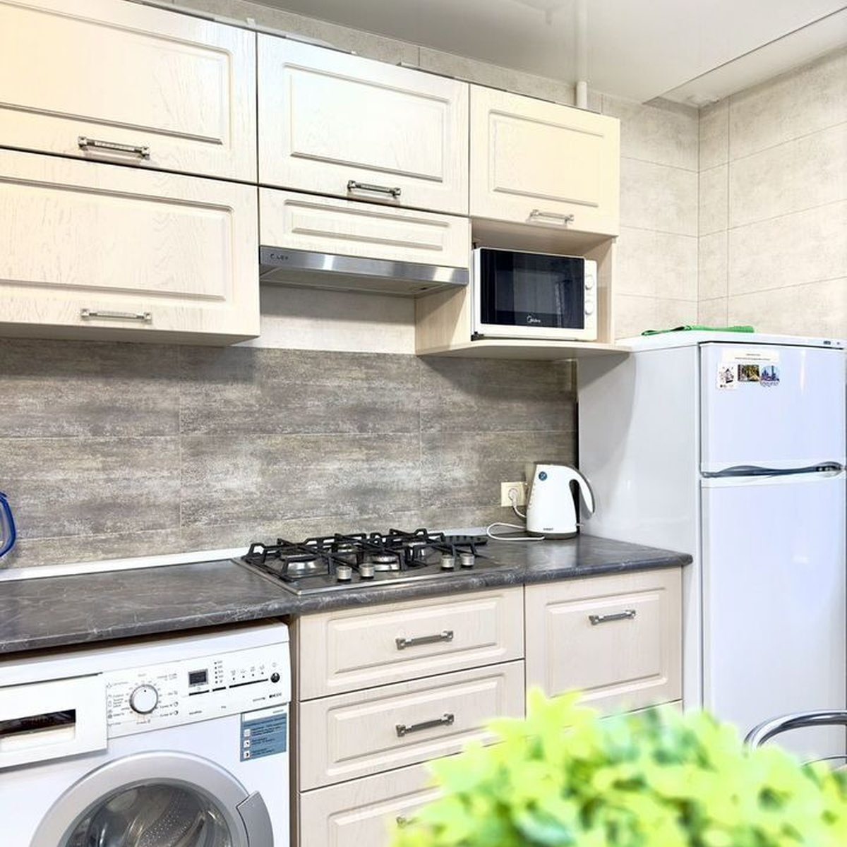 Кухня укомплектована светлым гарнитуром, обеденным столом, газовой плитой, микроволновой печью, электрочайником, холодильником. В доступности кондитерская, продовольственные магазины и кафе.