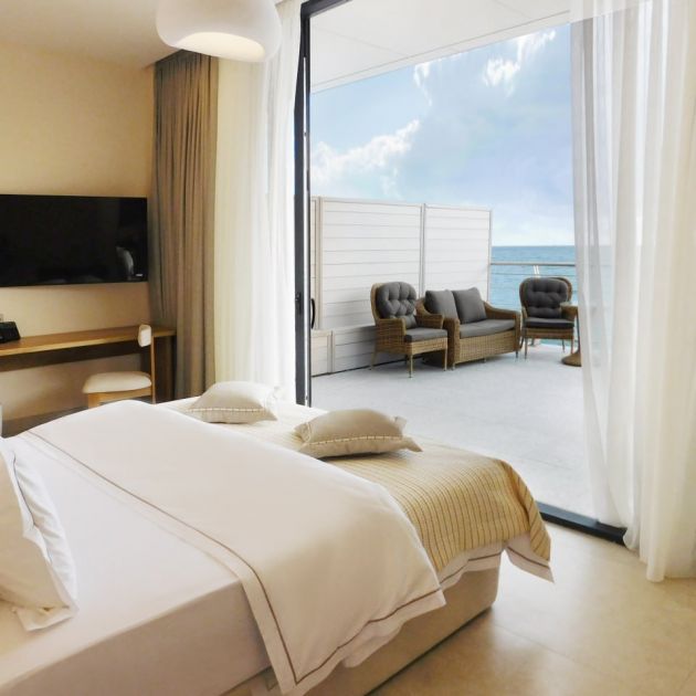 Отель находится в удобном расположении от набережной и пляжа. Можно пешком дойти за 10 мин. По пути хороший магазин ПУД. Цены не завышенные. В отеле хороший бассейн, есть бар с напитками, мороженое. Кулер с водой на каждом этаже. С собой привозили чайник и утюг. В номере этого нет. Только стаканы и тарелки. У нас были двухкомнатные апартаменты с террасой, с шикарным видом на море. В комнатах кровати, шкафы, телевизоры, стол, светильники настольные, холодильник. Вообщем все хорошо и комфортно. Соответствует цене. Подробнее