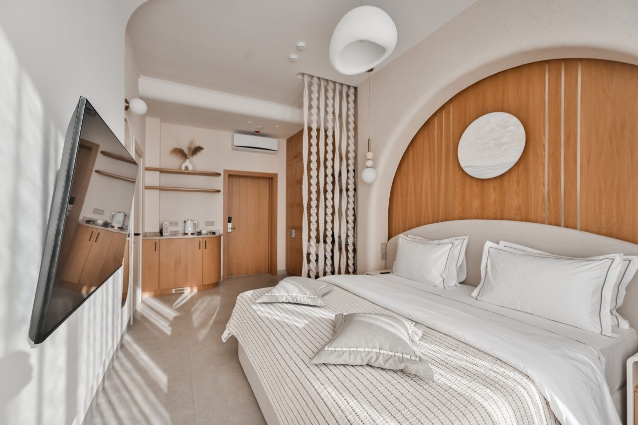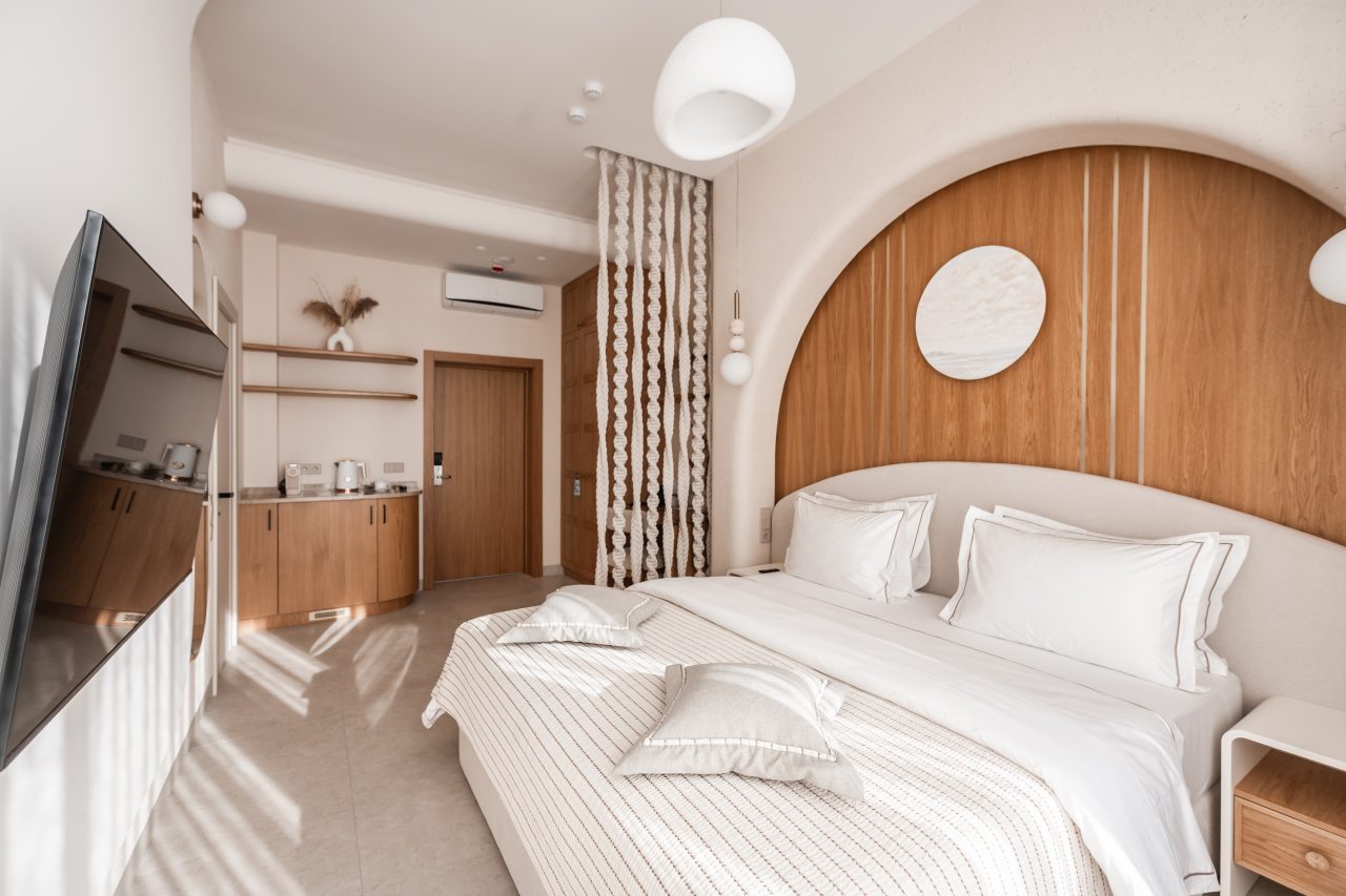 Внутри номера продумано всё для комфортного отдыха и проживания, включая большую и удобную кровать, телевизор, различные сценарии освещения, а также индивидуальный санузел с комплектом полотенец и гигиенических средств.