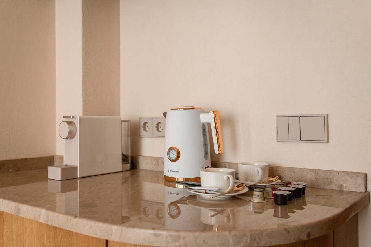 Чтобы вы в любой момент могли насладиться любимым напитком, в номерах установлены чайник и кофемашина. А в кафе на территории «Sky Hotel» вы сможете попробовать вкусные и сытные блюда, приготовленные профессионалами.