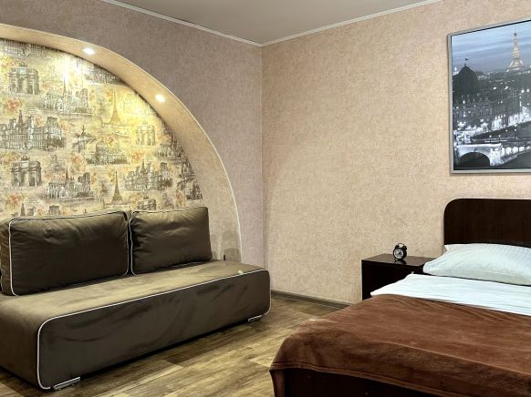 Уютные апартаменты с современным ремонтом прекрасно подходят для размещения. Внутри есть все необходимое для проживания: диван-кровать, плотные шторы для крепкого сна, туалетный столик, телевизор и Wi-Fi. Также гостям предоставляются одноразовые тапочки, гигиенический набор и комплект полотенец.
