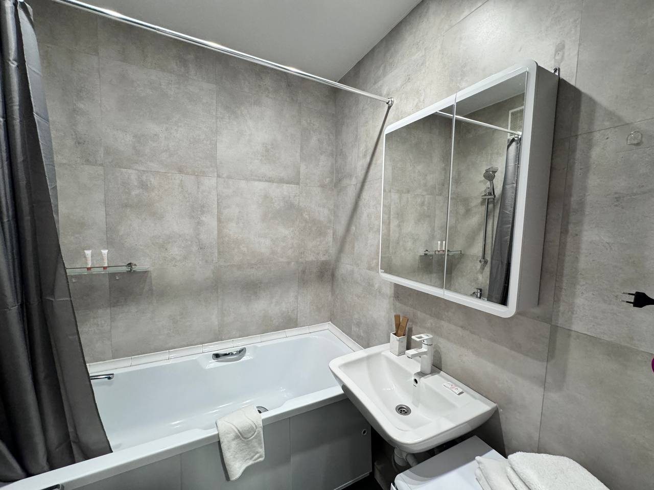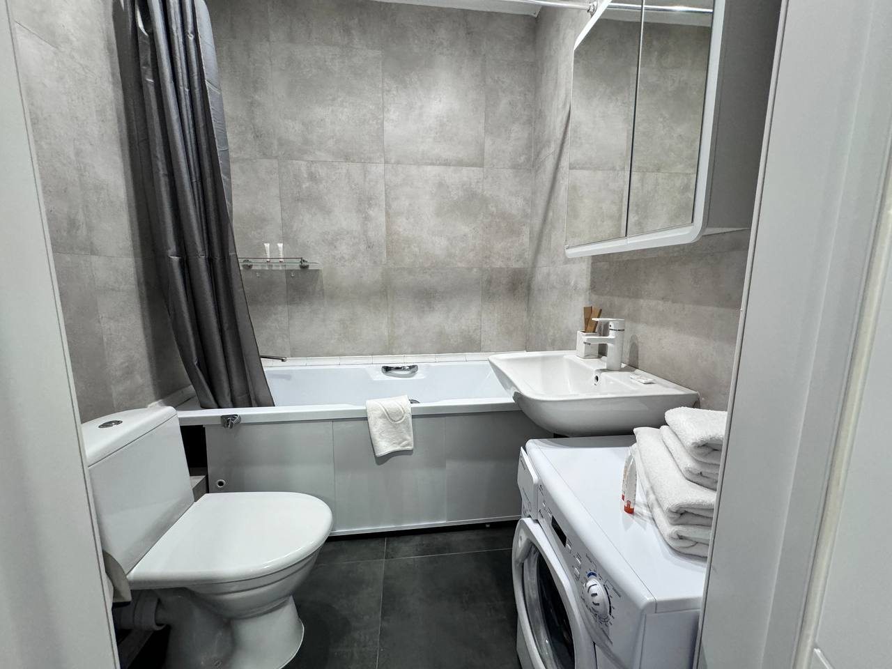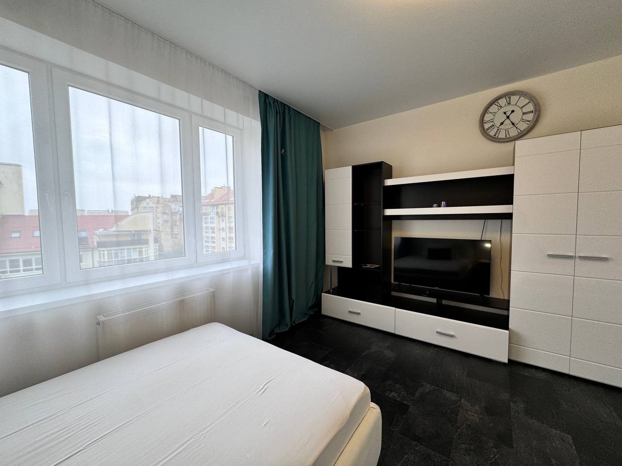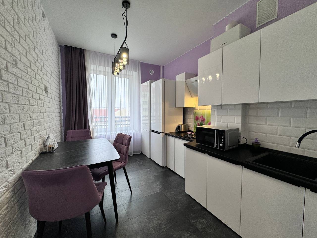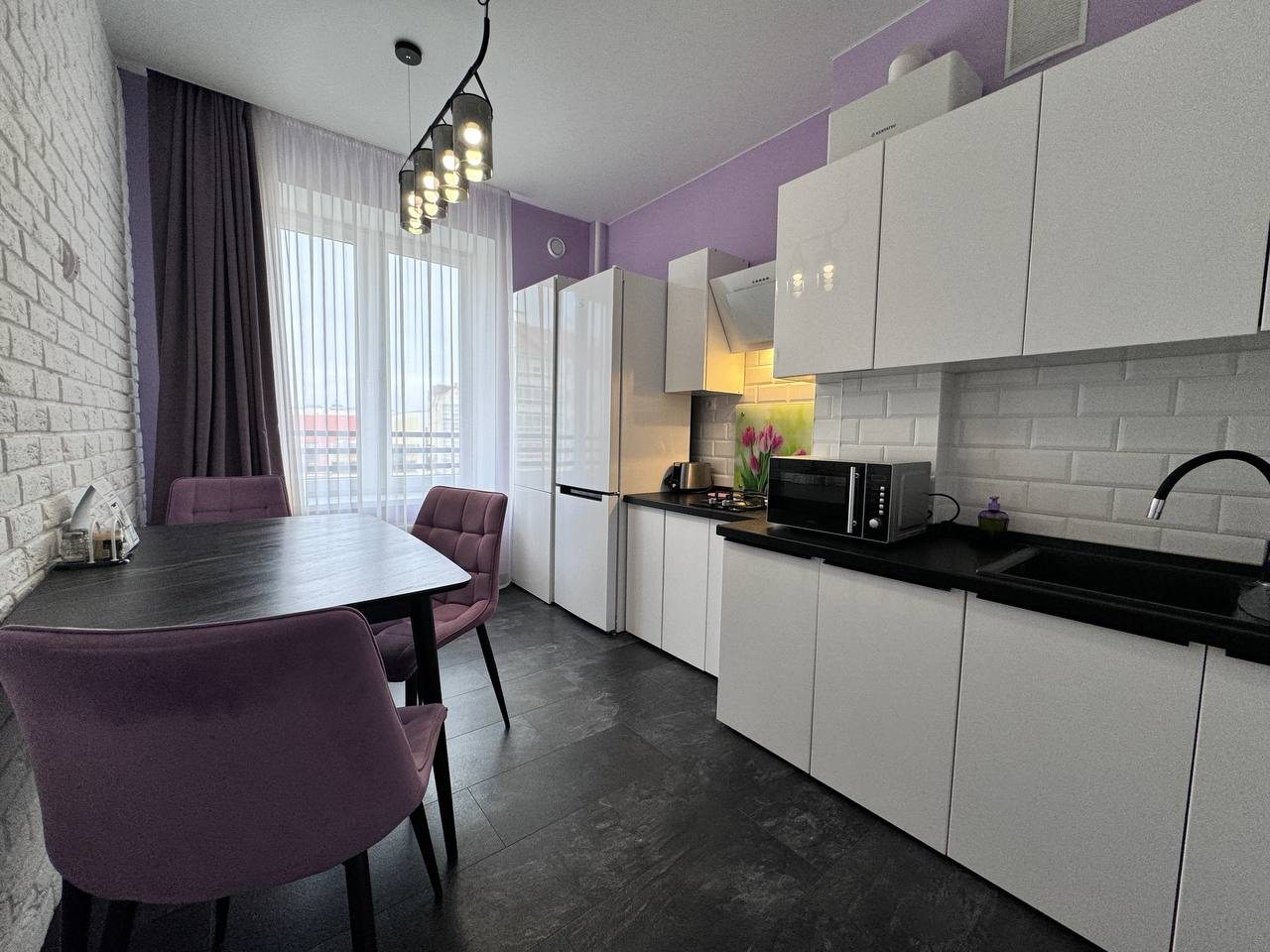 В апартаментах отличная обстановка. Солидно смотрится ремонт, нет лишних раздражителей. С балкона вид во двор интересный. Мебель хорошая, кровать удобная. Телевизор с разными каналами висит удобно перед спальным местом. Понравилась удобная ванна. И конечно кухня с хорошим наполнением. Цена считаю, что оптимальная.