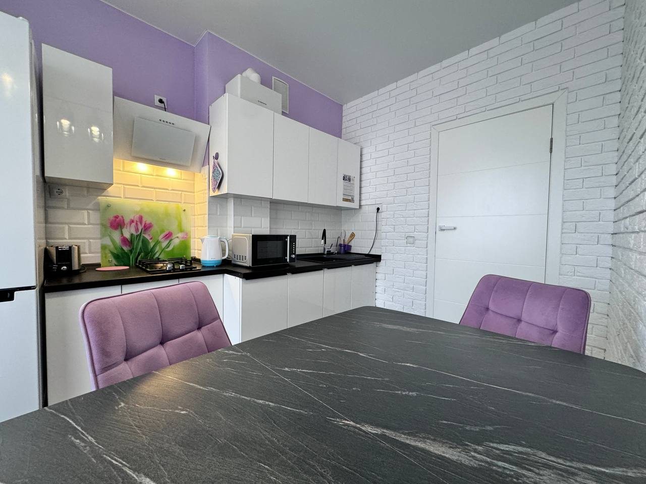 На стильной зоне кухни точно захочется заняться созданием кулинарных шедевров. Для этого есть электрические приборы и необходимая посуда. В доме находится кондитерская, в шаговой доступности продуктовые магазины.