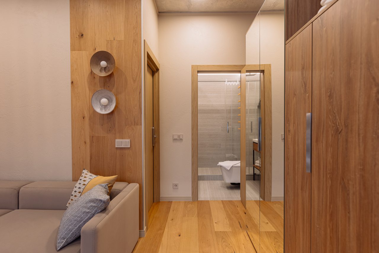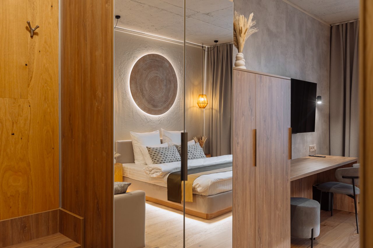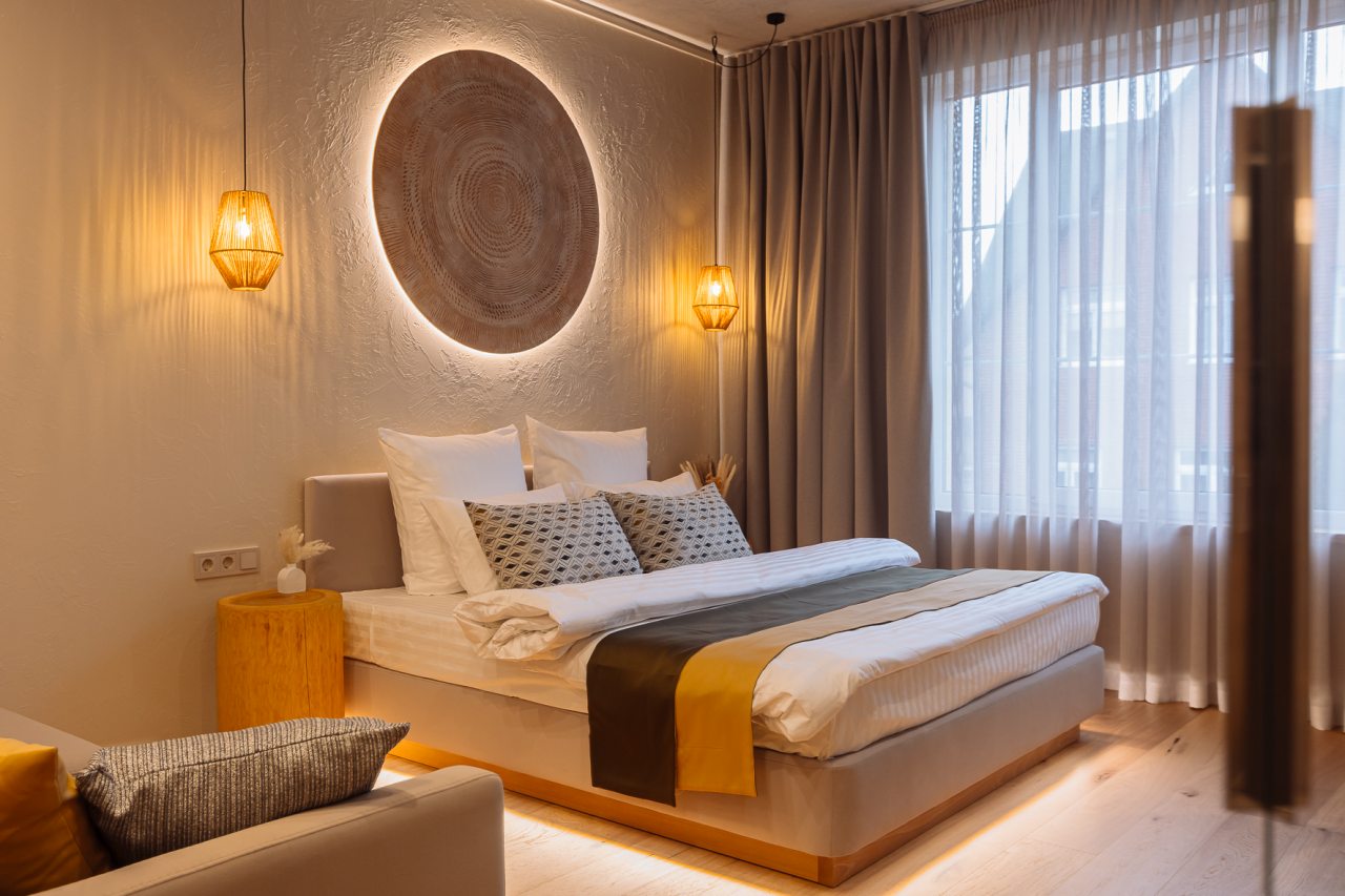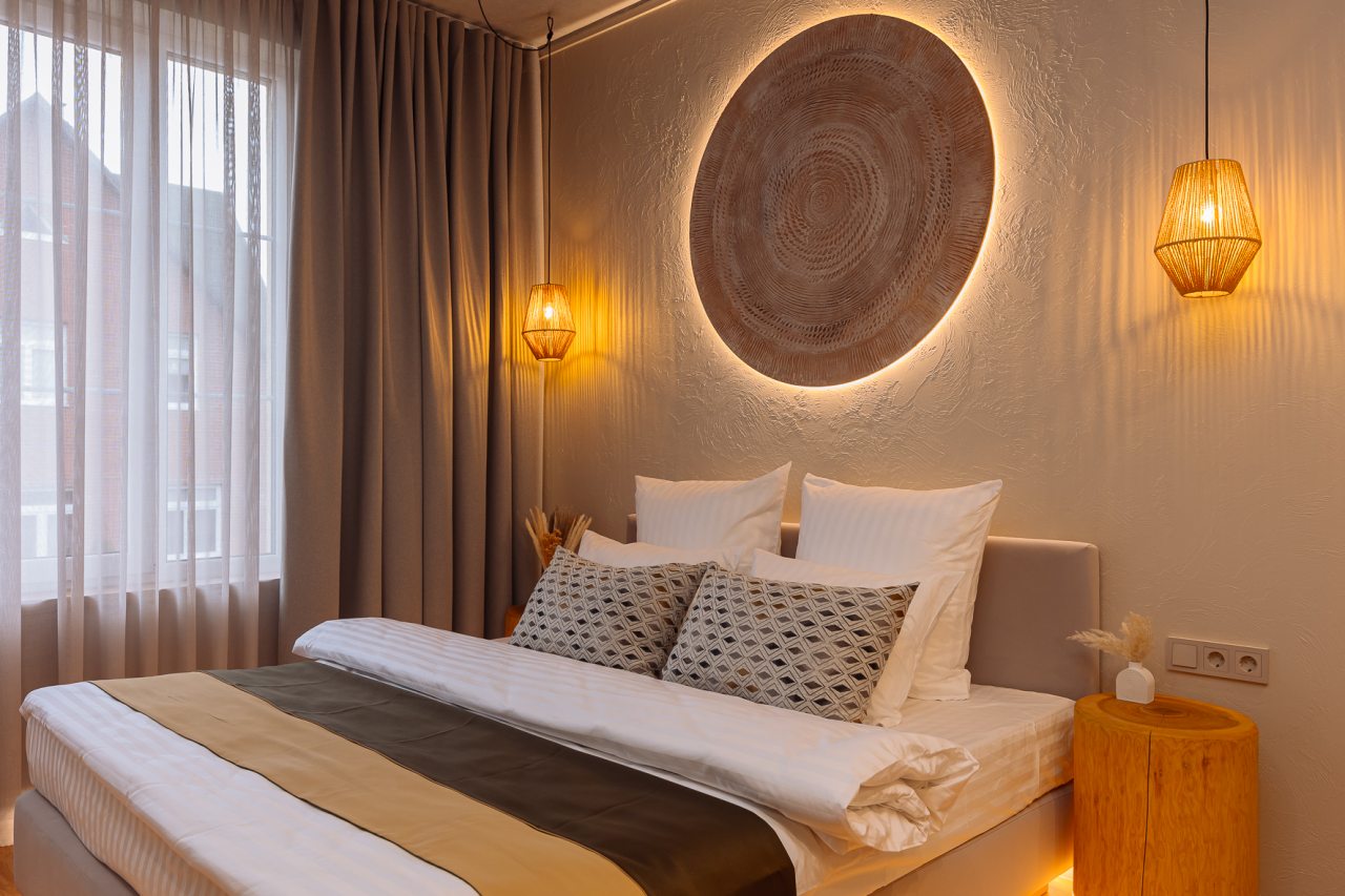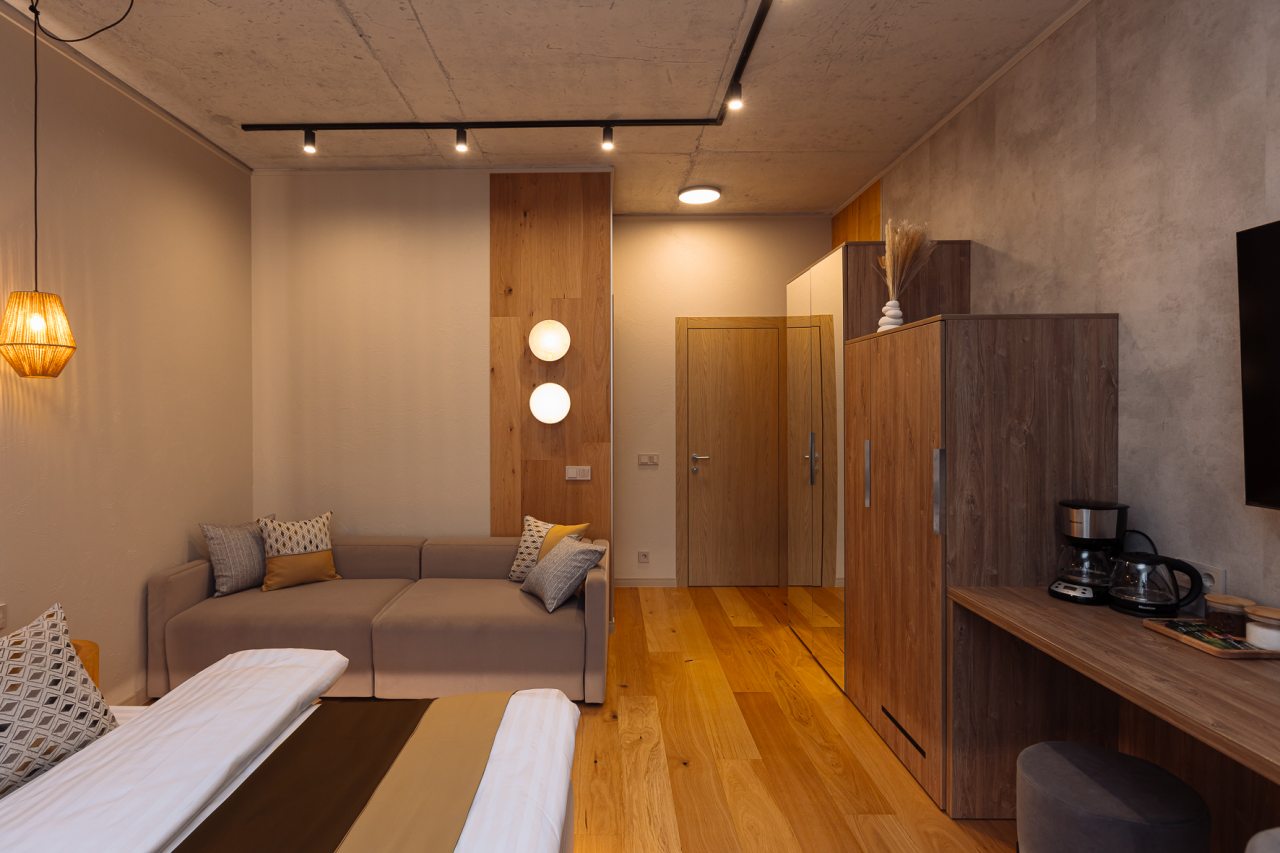 Уютные апартаменты с современным ремонтом оборудованы двуспальной кроватью, шкафом, письменным столом, телевизором, вешалками для верхней одежды, диваном, wi-fi и др. Санузел укомплектован качественной сантехникой и средствами личной гигиены.