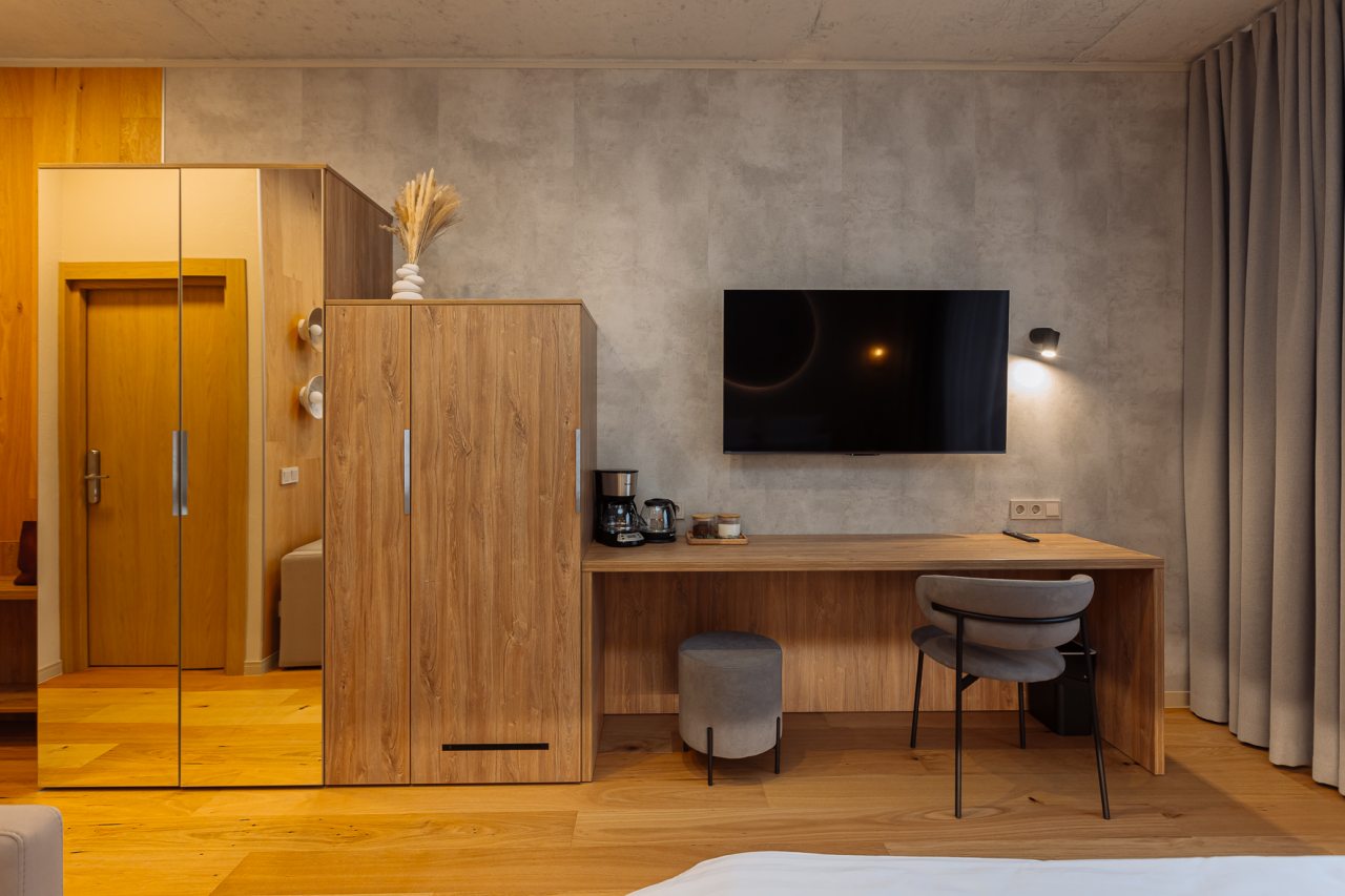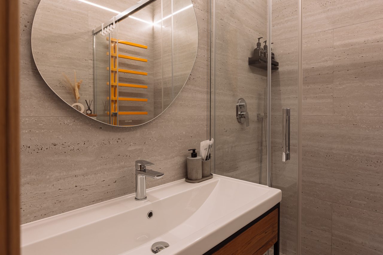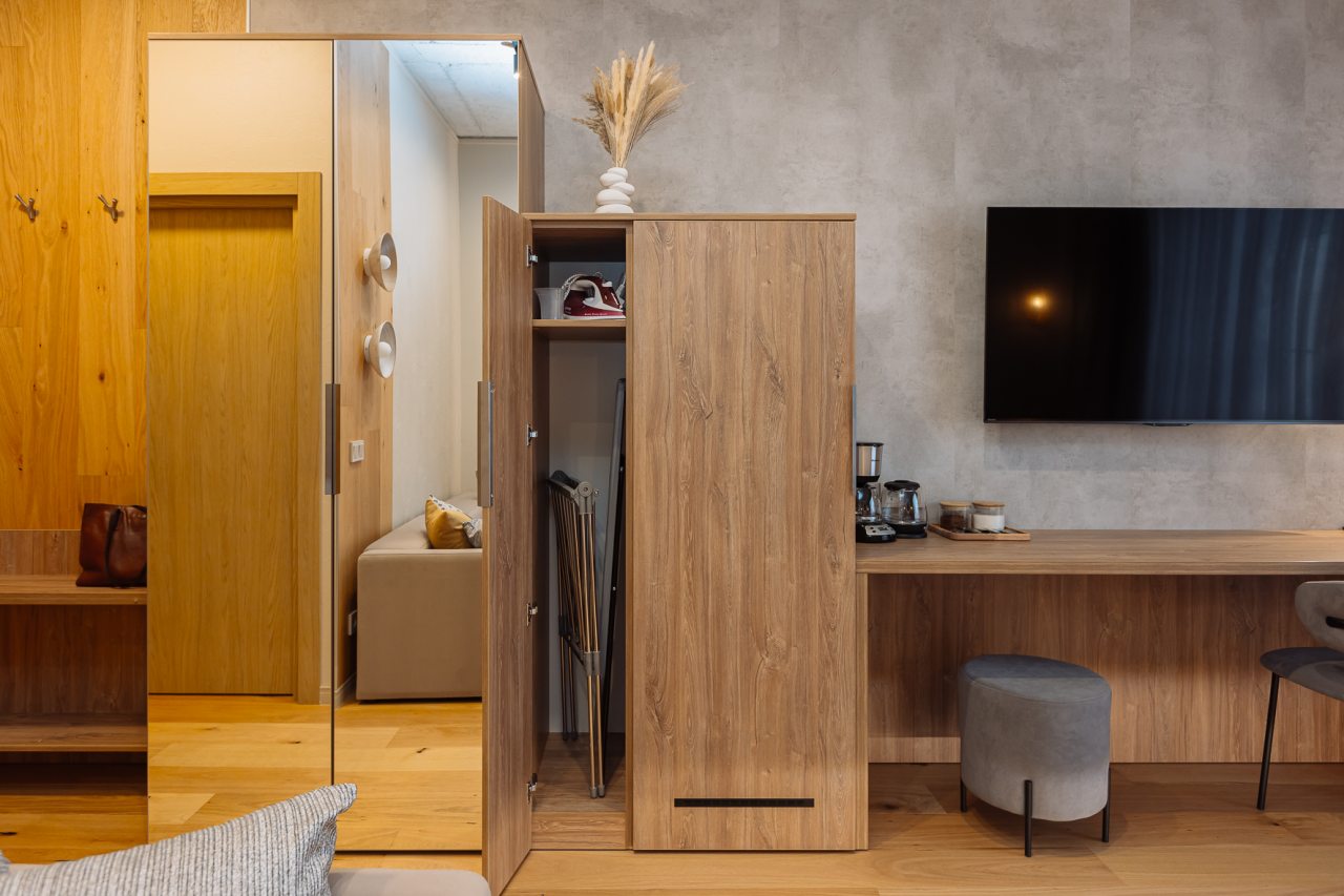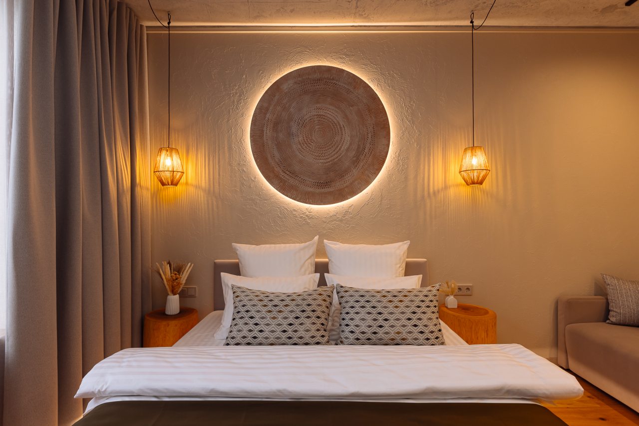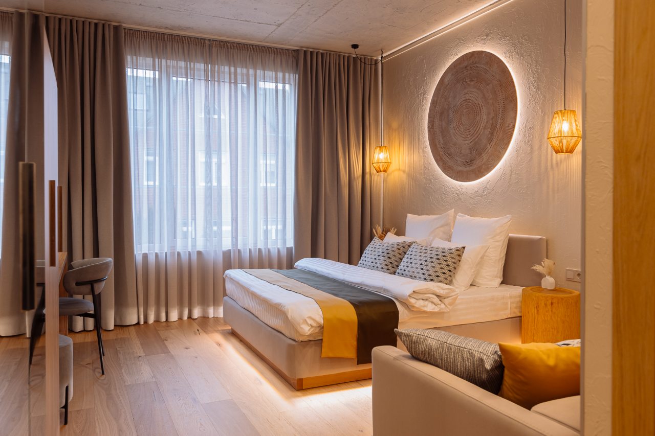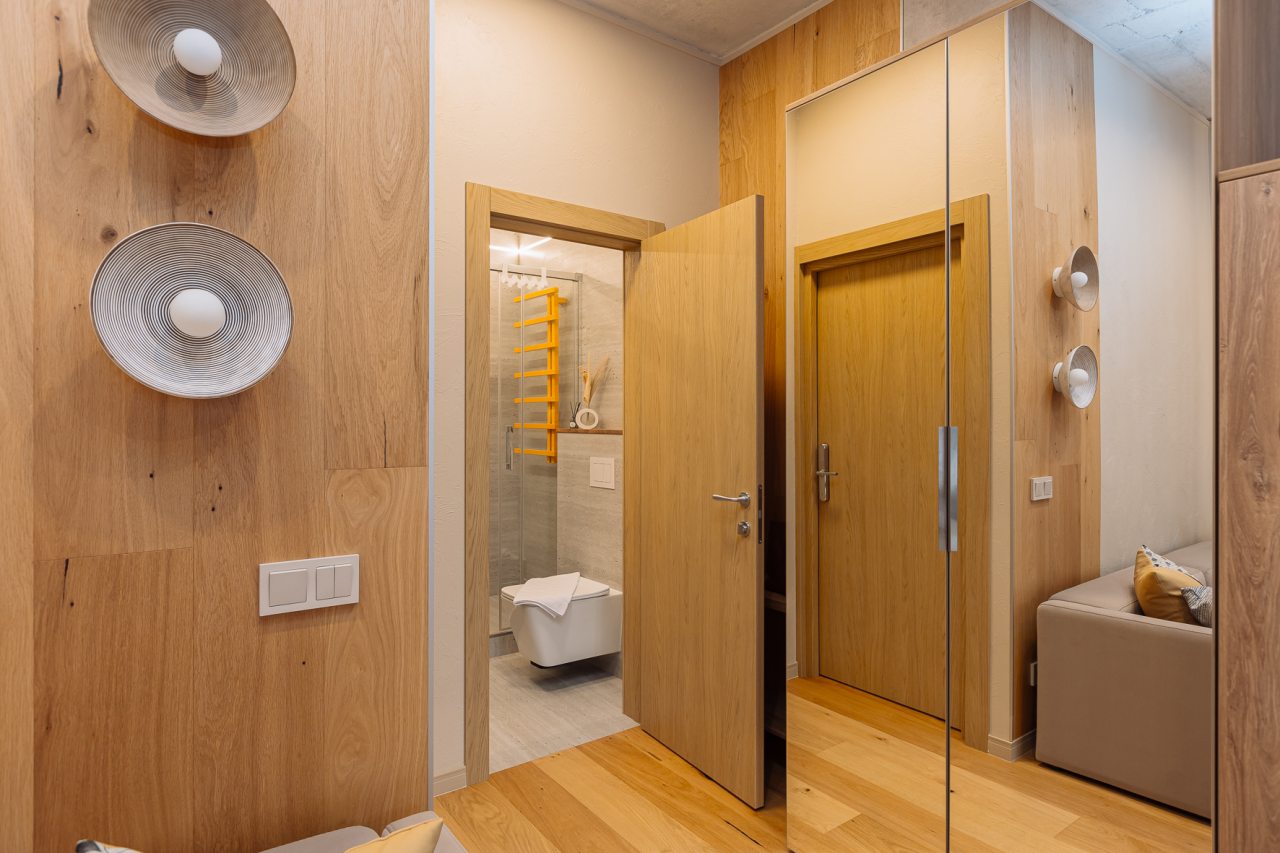 Уютные апартаменты с современным ремонтом оборудованы двуспальной кроватью, шкафом, письменным столом, телевизором, вешалками для верхней одежды, диваном, wi-fi и др. Санузел укомплектован качественной сантехникой и средствами личной гигиены.