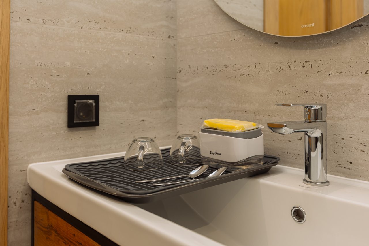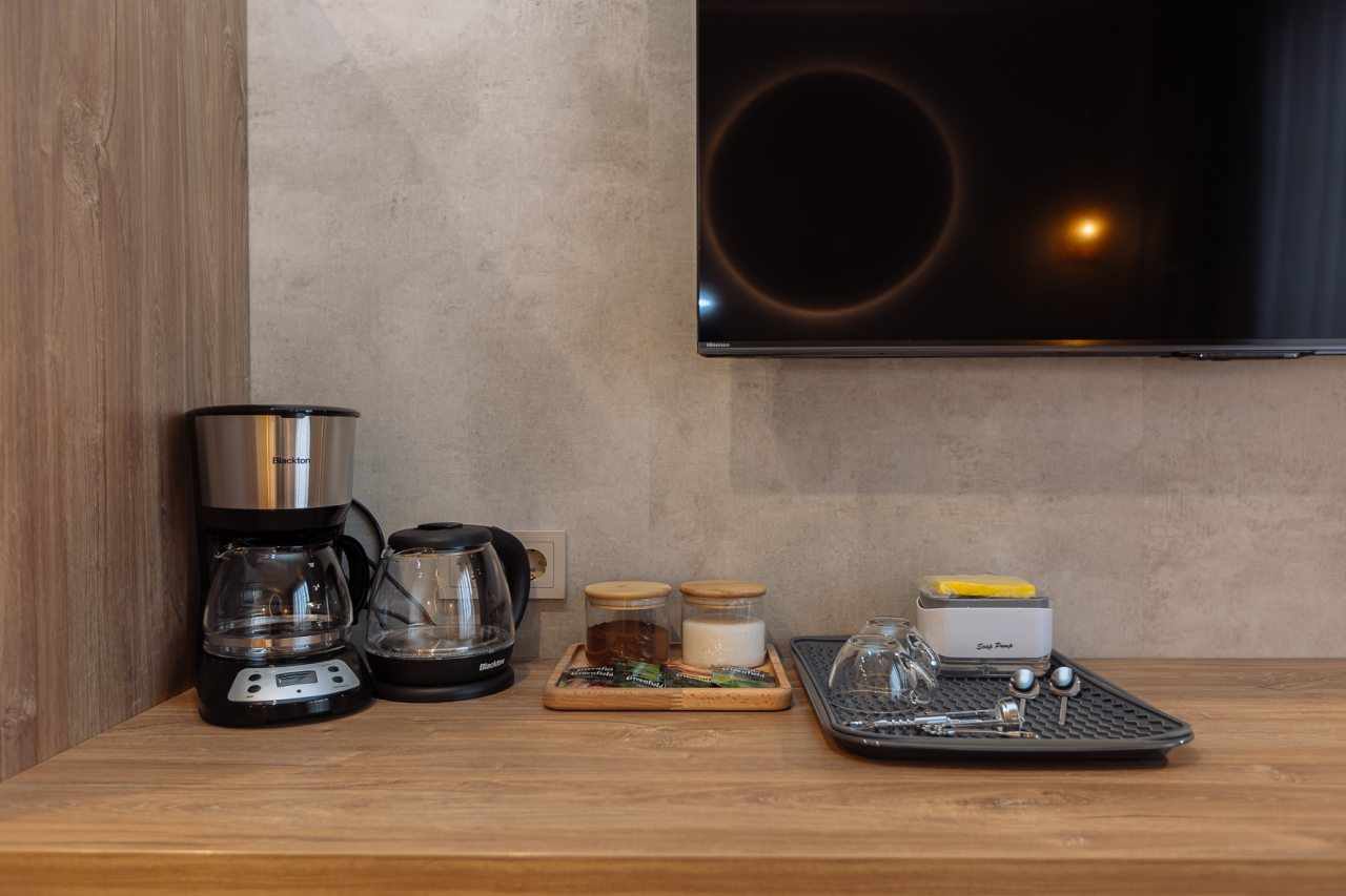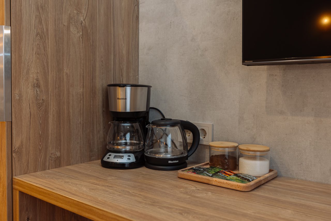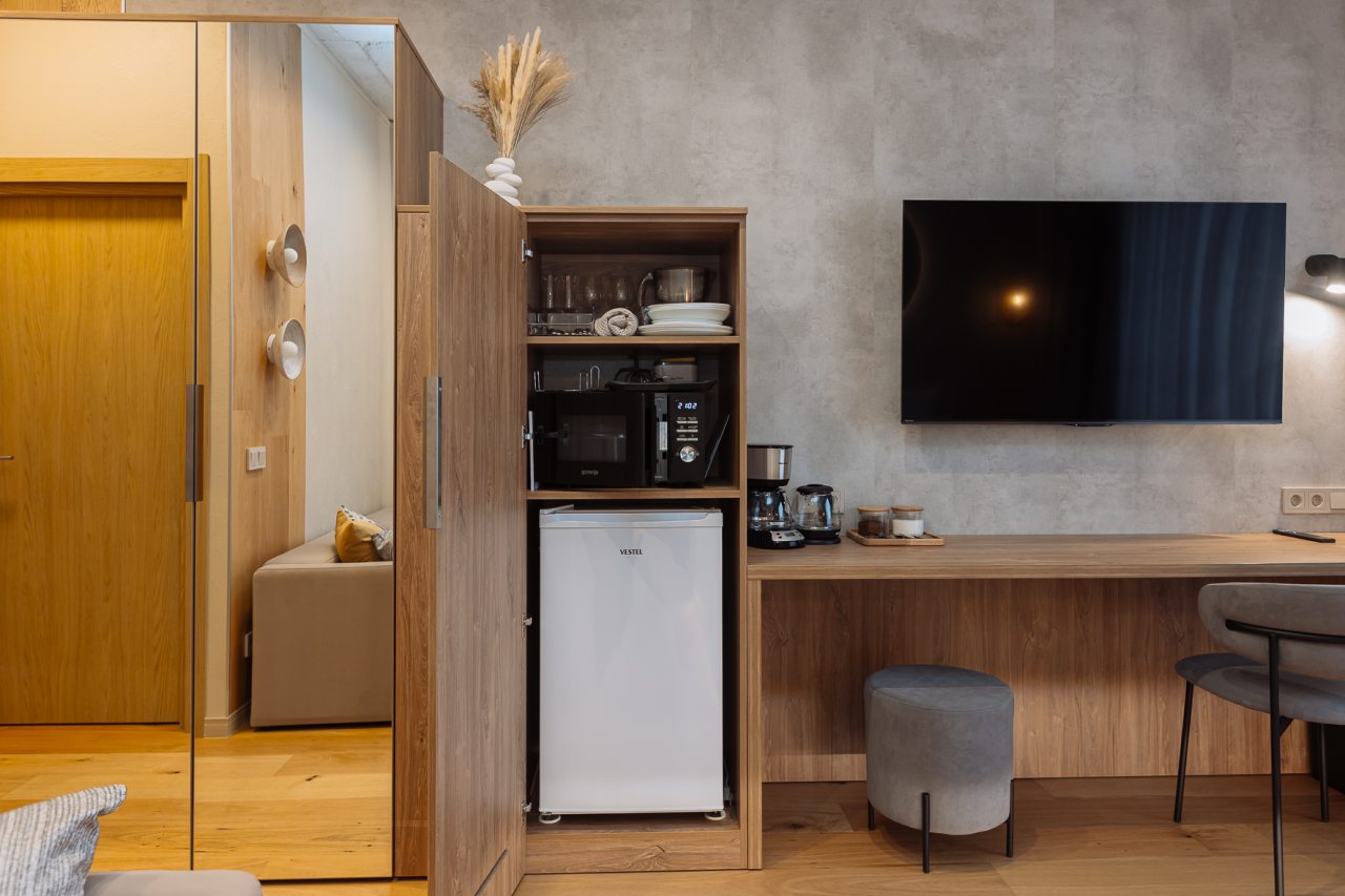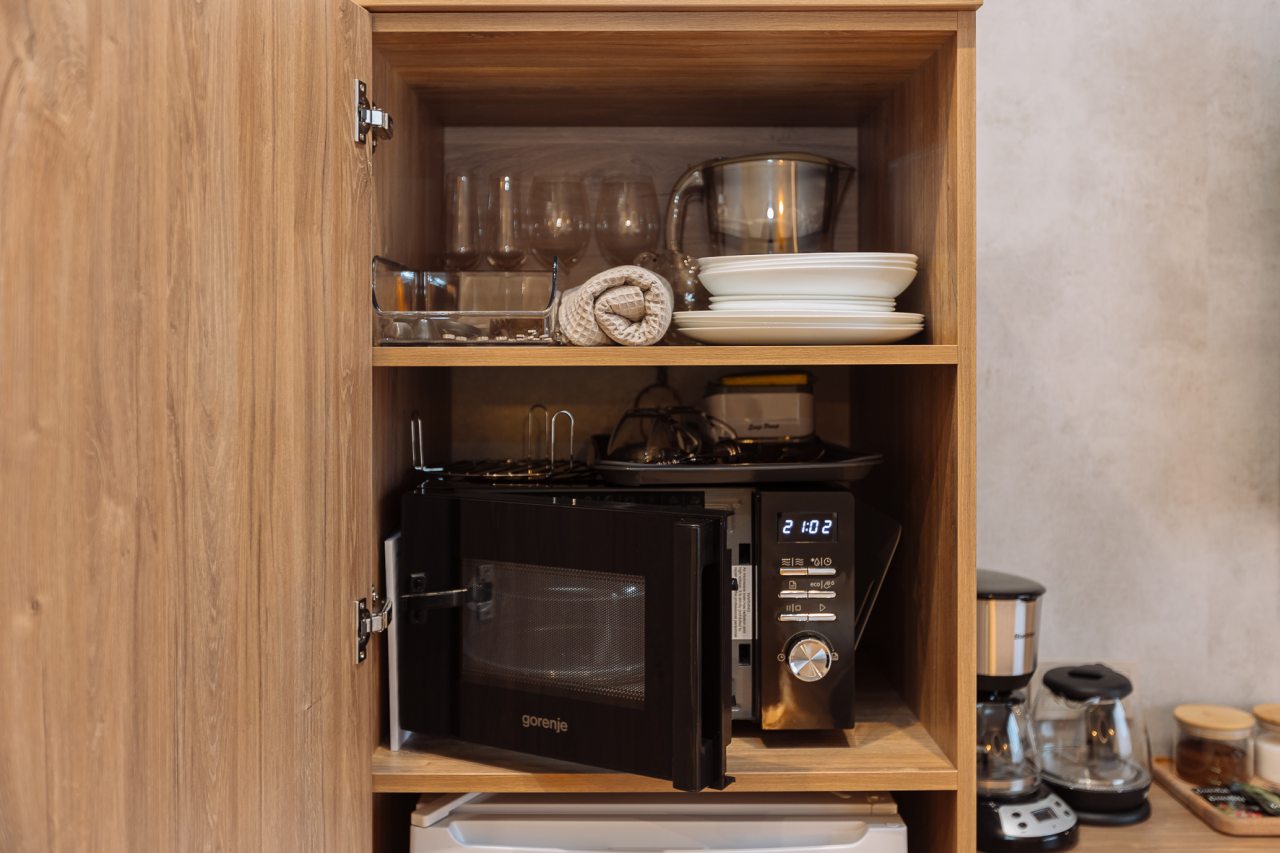 Кухонная зона оснащена микроволновой печью, холодильником, кофемашиной и набором посуды. Пообедать можете в ближайшем кафе.