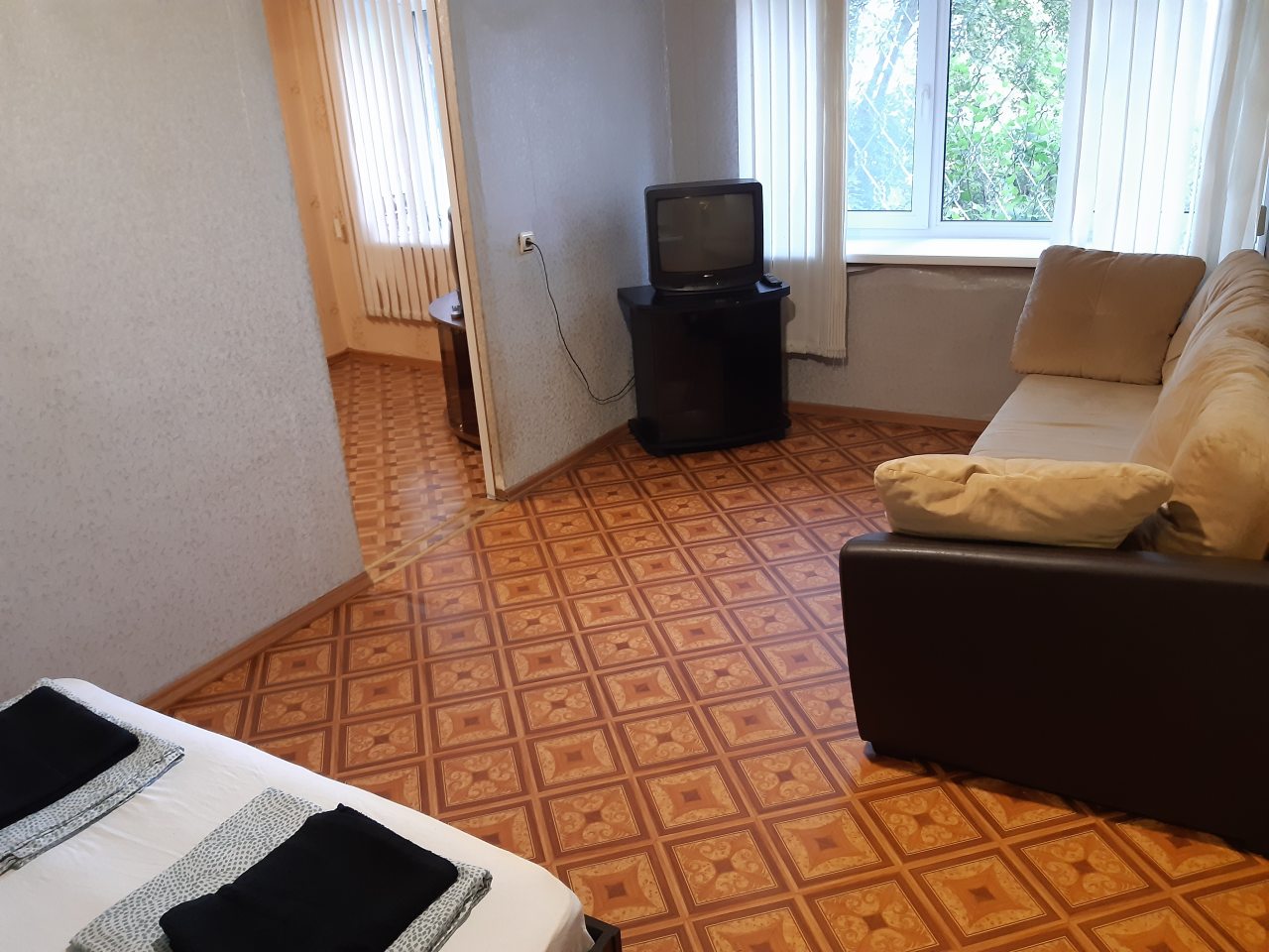 Отдыхающим предлагается разместиться в двухкомнатной квартире, где установлены два телевизора, несколько спальных мест, имеется Wi-fi и собственная ванная комната со стиральной машиной.