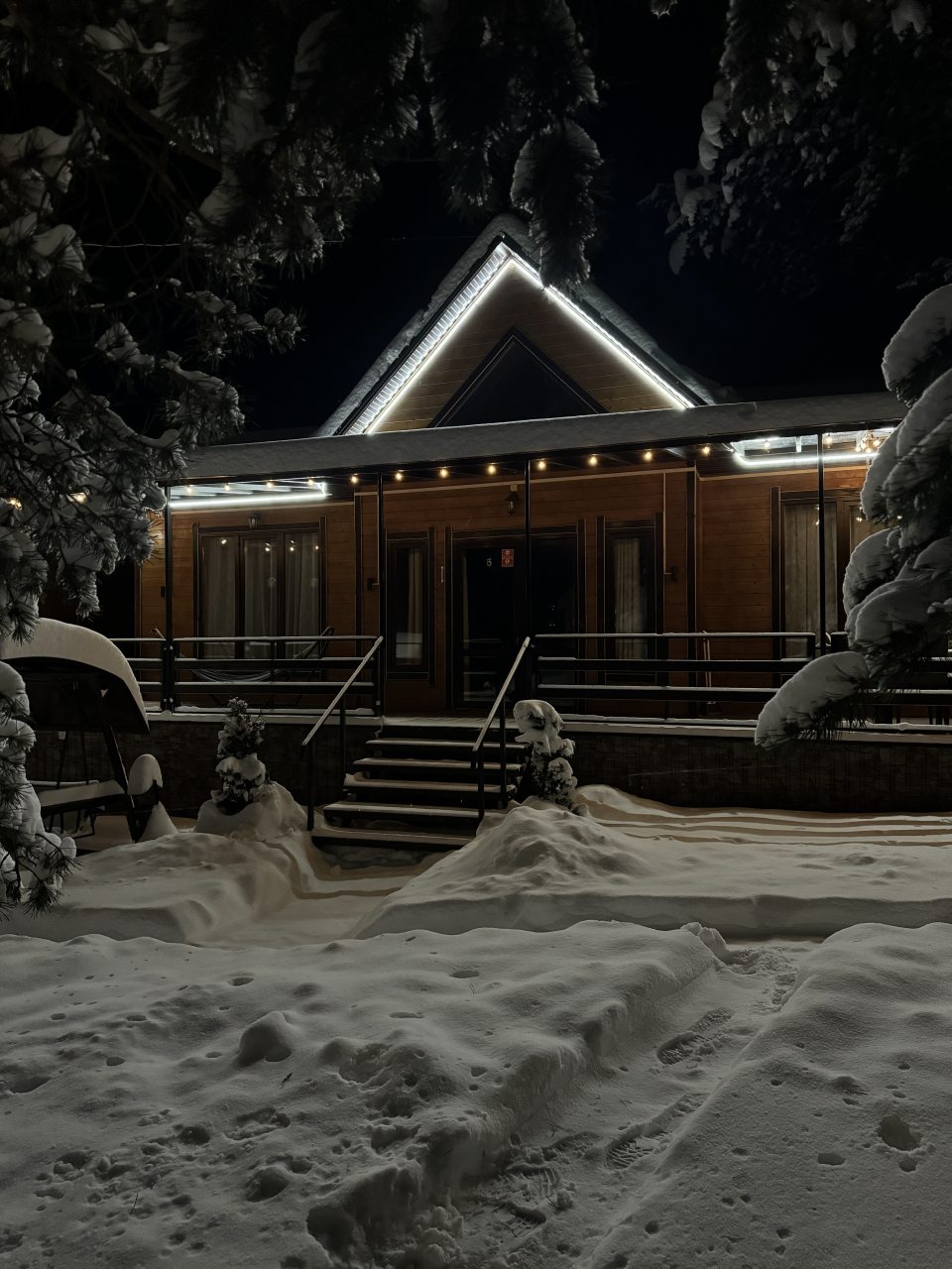 Очень большая база отдыха. Столько места для прогулок. Очень тихий и размеренный отпуск. При этом сделан все супер-современно, вечером красивая подсветка. Прекрасная банька. Номер на семью. Дети спали на двухуровневой кровати, мы на двуспальной. Места немного, но на несколько дней нормально.