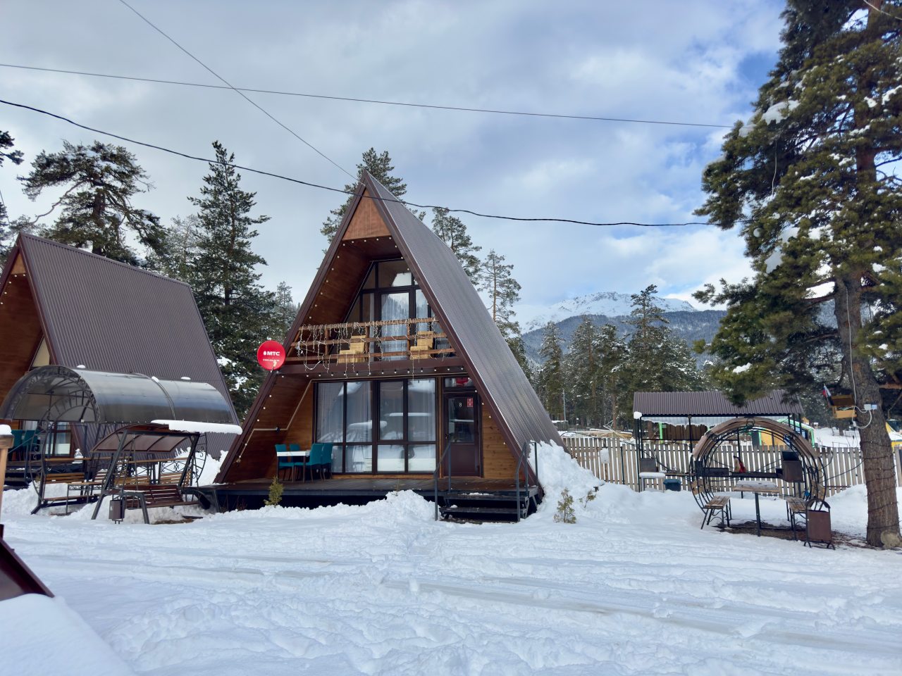 Прекрасные домики для отдыха. Здесь замечательно отдыхать большой компанией. На территории расположены игровая площадка для детей, место для стоянки автомобилей и зона барбекю. Прямо напротив находится кафе, где довольно вкусно готовят. Неподалеку есть живописное озеро и бассейн, расположенный на крыше.