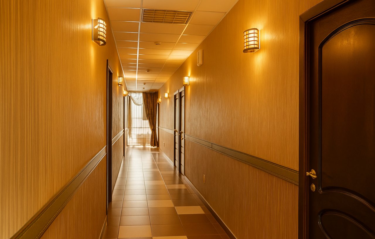 Номер не прокуренный чистый, есть одноразовые тапки, зубные щётки и средства первой необходимости. За стойкой регистратуры встретила приветливо женщина, которая быстро оформила документы и выдала ключи. В коридоре есть гладильная доска с утюгом. Пребыванием довольны