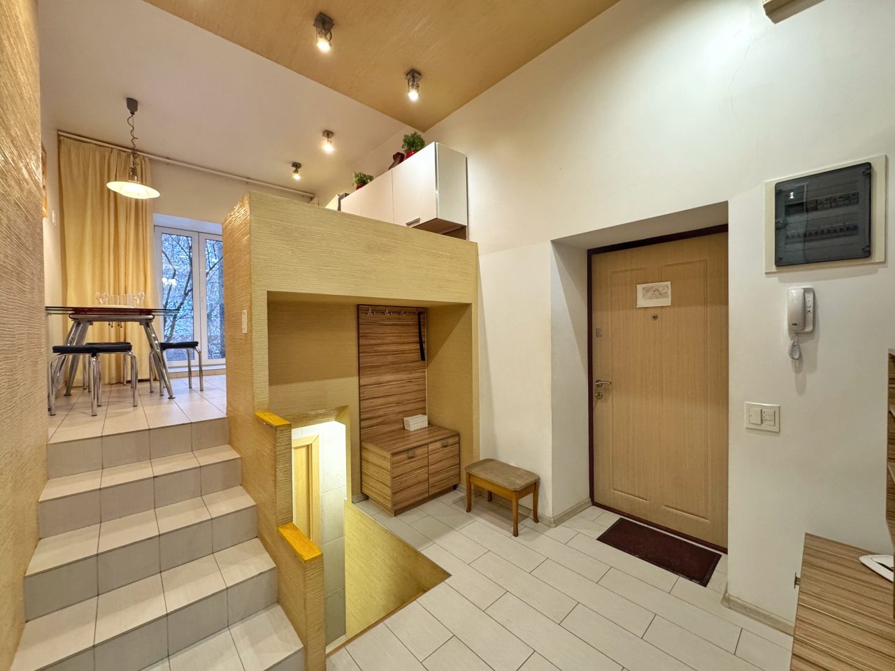 Находясь на первом этаже, апартаменты отличаются высокими потолками, создавая ощущение простора и комфорта. Главная изюминка - двухуровневая кухня-гостиная с удобной кухней и роскошным раскладывающимся кожаным диваном. В спальне также имеется кожаный диван и кровать на чердаке, создавая уютное и стильное оформление.