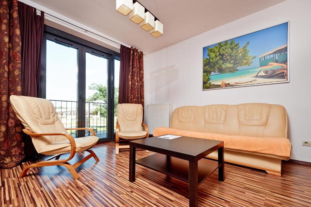 В апартаментах есть кондиционер, кухня с холодильником, гостиная с телевизором с плоским экраном, а также собственная ванная комната с феном и бесплатными туалетно-косметическими принадлежностями.