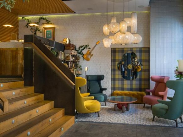 Помещения и номера отеля оформлены в черно-бело-зеленой цветовой гамме.