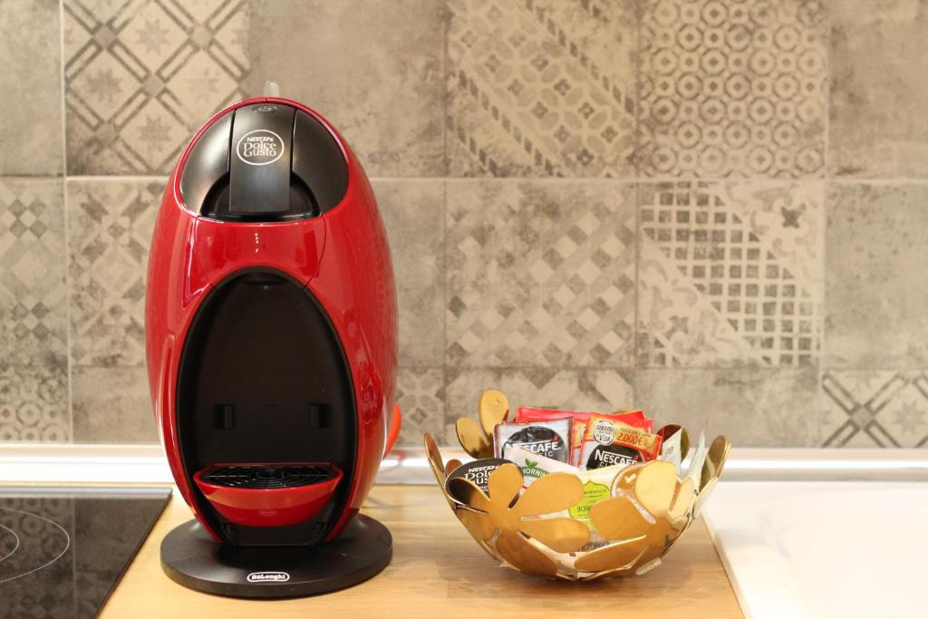 На полноценной кухне имеется посуда, тостер, микроволновая печь, холодильник и итальянская кофеварка.